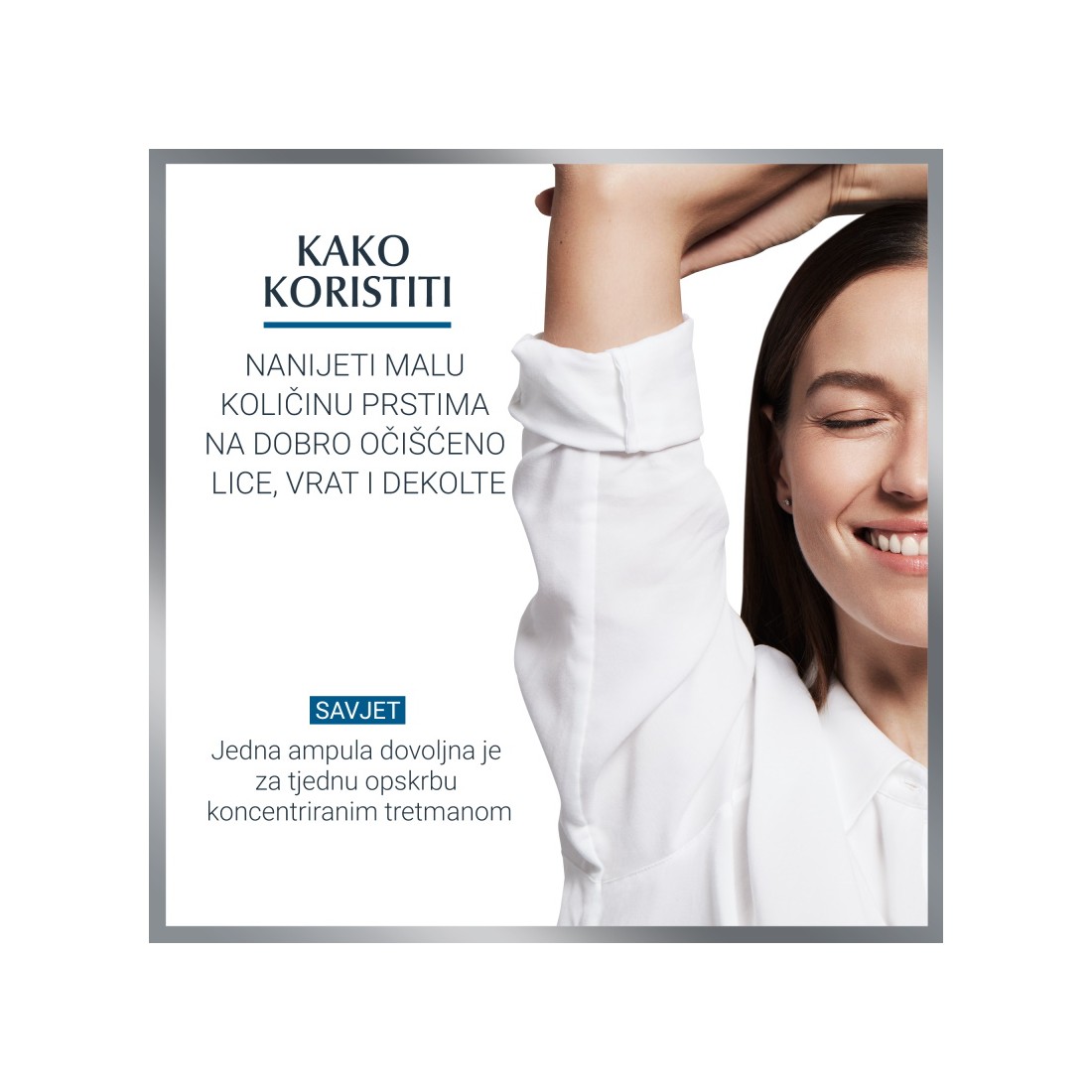 - Nanijeti nježnim pokretima dvaput dnevno na čistu kožu prije dnevne anti-age njege, s naglaskom na zahvaćena područja.