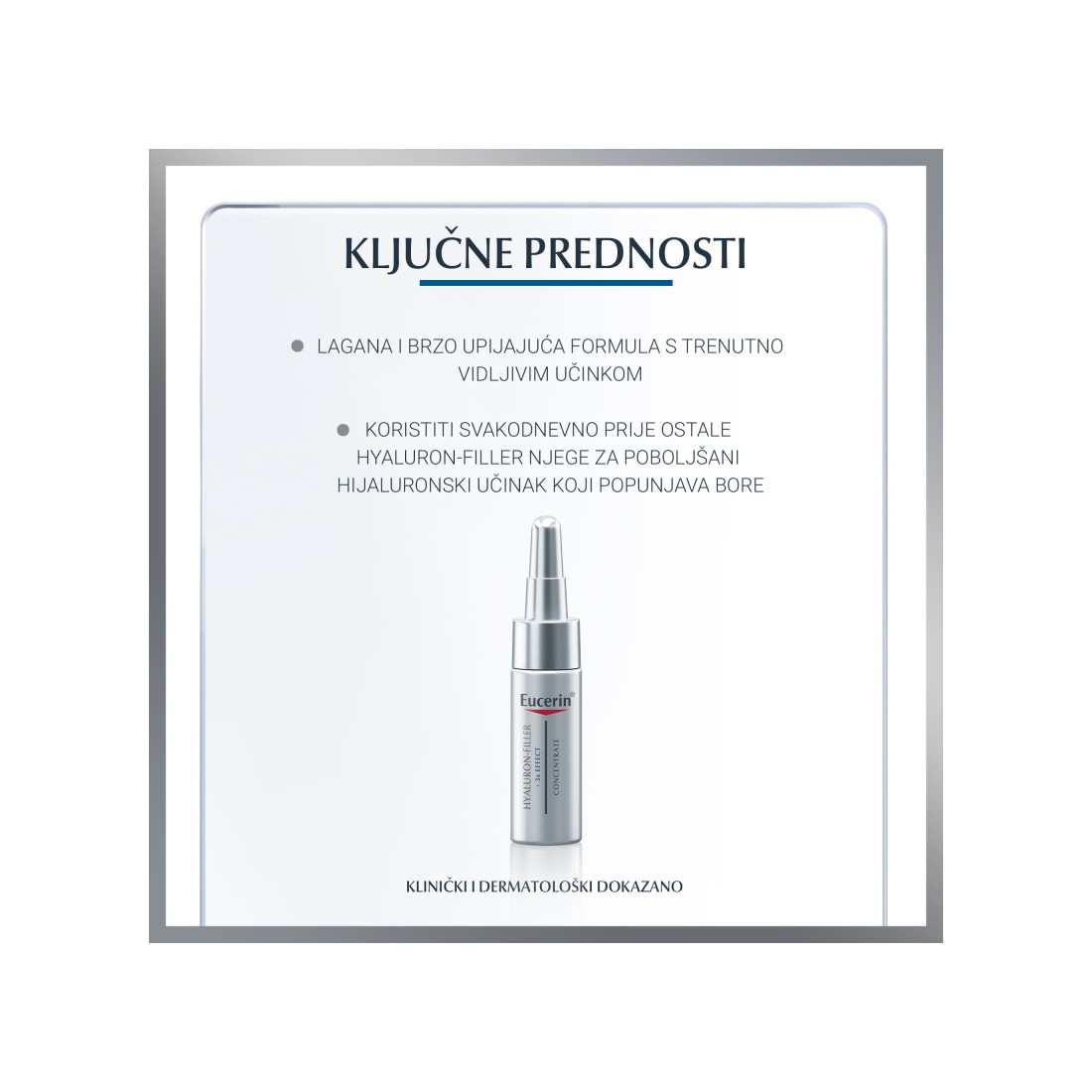 Eucerin Hyaluron-Filler koncentrirani tretman intenzivni je serum protiv bora dizajniran za svakodnevnu uporabu u kombinaciji s dnevnim i noćnim kremama Eucerin Hyaluron-Filler. Lagana formula kombinira visoko i niskomolekularnu hijaluronsku kiselinu, glicin saponin i enoksolon popunjava čak i duboke bore. Visokomolekularna hijaluronska kiselina poboljšava hidraciju i zaglađuje najudaljenije slojeve kože, dok niskomolekularna hijaluronska kiselina, koja je 40 puta manja, prodire dalje u slojeve kože epiderme odakle nastaju dublje bore. Antioksidans glicin-saponin podržava proizvodnju hijaluronske kiseline u sloju kože gdje nastaju najdublje bore i štiti od slobodnih radikala. Enoksolon štiti vlastiti hijaluron kože od propadanja.