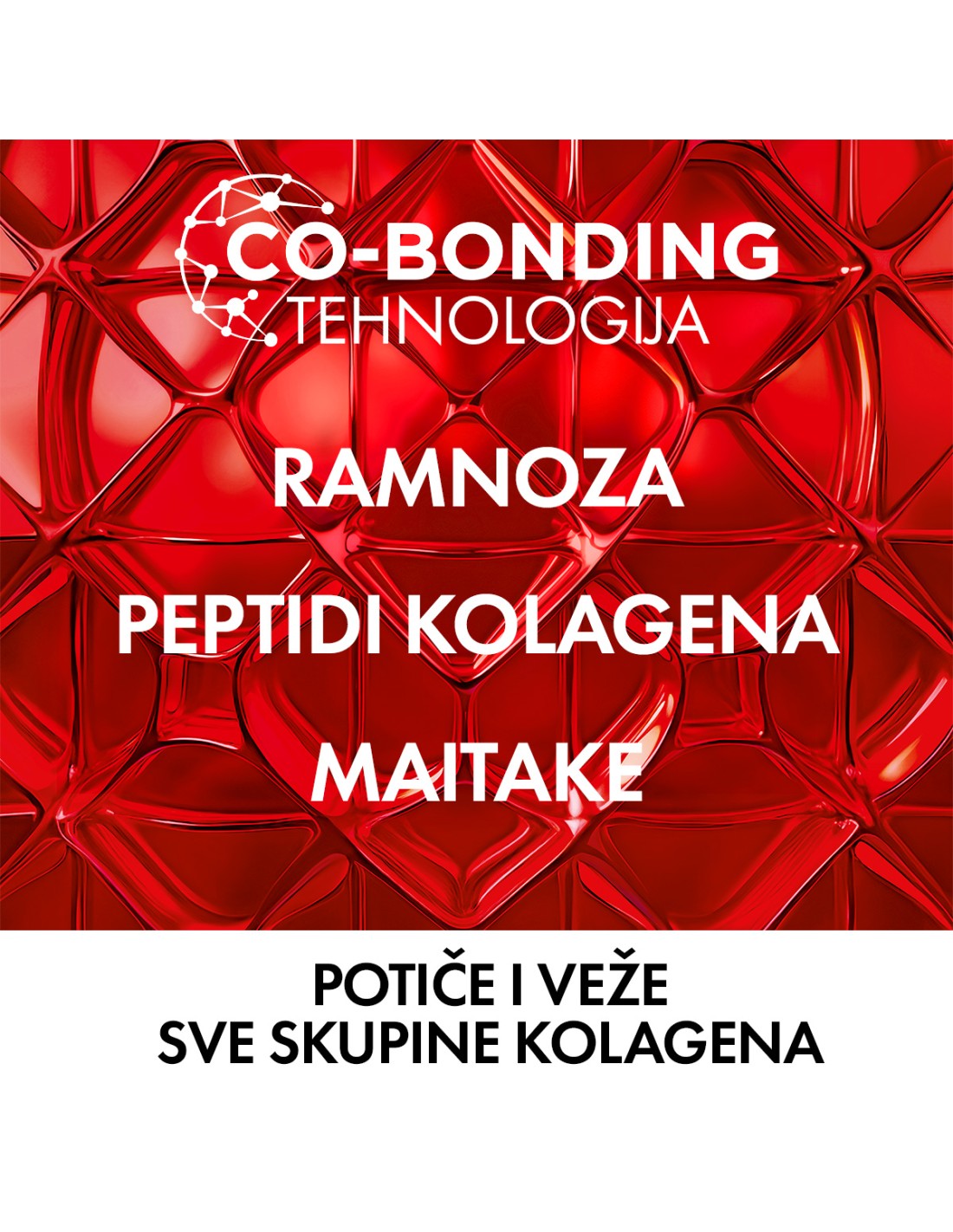 Co-bonding tehnologija [ramnoza+peptidi+Maitake] potiče i veže skupine kolagena.* +  [SPF 50] štiti kožu od dnevnog izlaganja suncu.