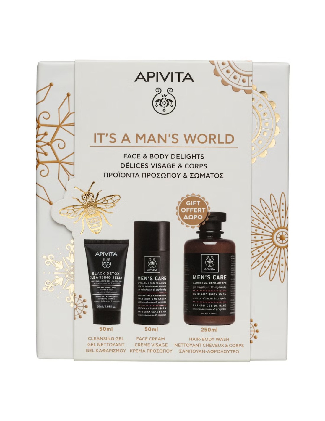 Apivita Božićni Set 2025 za muškarce kosa/lice/tijelo Promo pakiranje sadrži Apivita Men's care Anti Wrinkle anti-fatigue face and eye cream i Apivita Men's care Hair and Body Wash with Cardamom and propolis i Apivita Black Detox Cleanser.