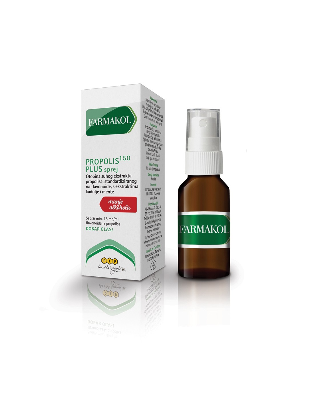 Sastav: Flavonoidi nativnog pročišćenog propolisa standardiziranog na flavonoide 0,3 g, alk. ekstrakt kadulje (ex. Salvia officinalis) 2,0g, alk. ekstrakt mente (ex. Mentha piperita) 1,6g, propilenglikol, alkohol i demineralizirana voda.