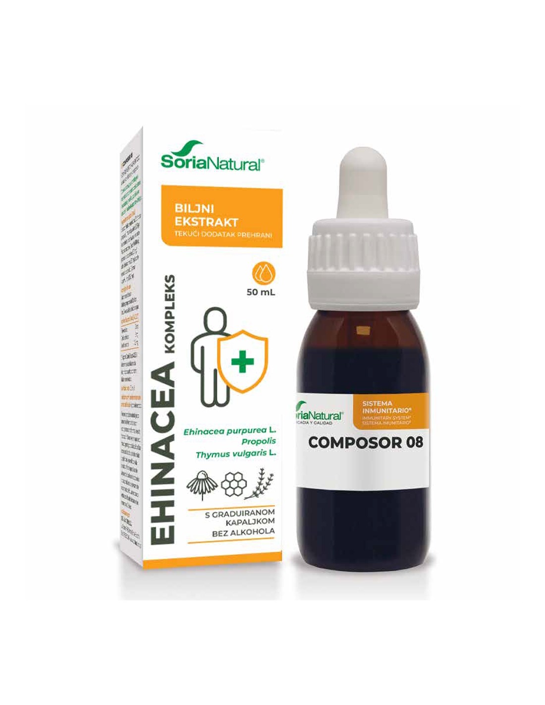 Ehinacea Plus kompleks – Composor 8 – mješavina tekućeg ekstrakta zeleni purpurne rudbekije (Echinacea purpurea (L.) Moench), tekućeg ekstrakta propolisa (Propolis) i eteričnog ulja lista timijana (Thymus vulgaris L.) u biljnom glicerolu.