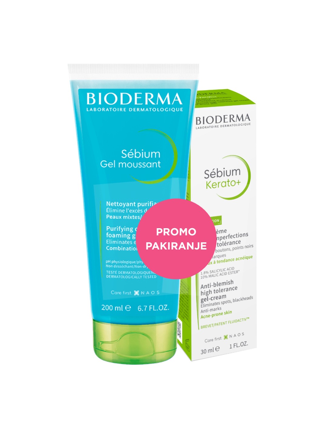 Promo pakiranje sadrži Sébium Gel moussant 200 ml i Sébium Kerato+ 30ml, idealan duo za higijenu i njegu kože sklone aknama.