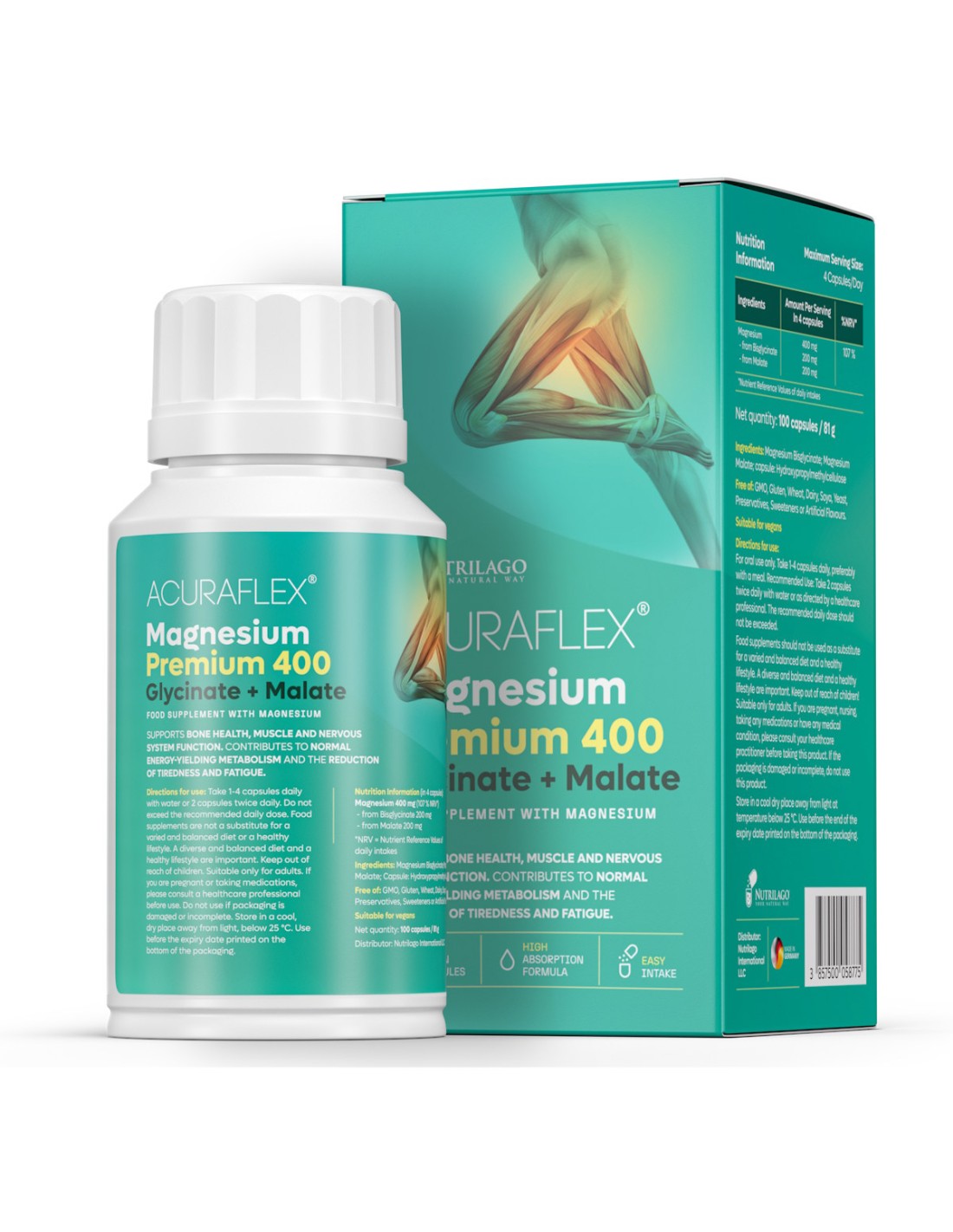 Acuraflex Magnesium Premium 400 kapsule sadrže magnezij u formi bisglicinata i malata, u jednakom omjeru, što jamči izvrsnu apsorpciju i bioraspoloživost. Preporučena dnevna doza raspoređena je u više kapsula, te se unos vrlo lako može na dnevnoj bazi prilagođavati Vašim potrebama.