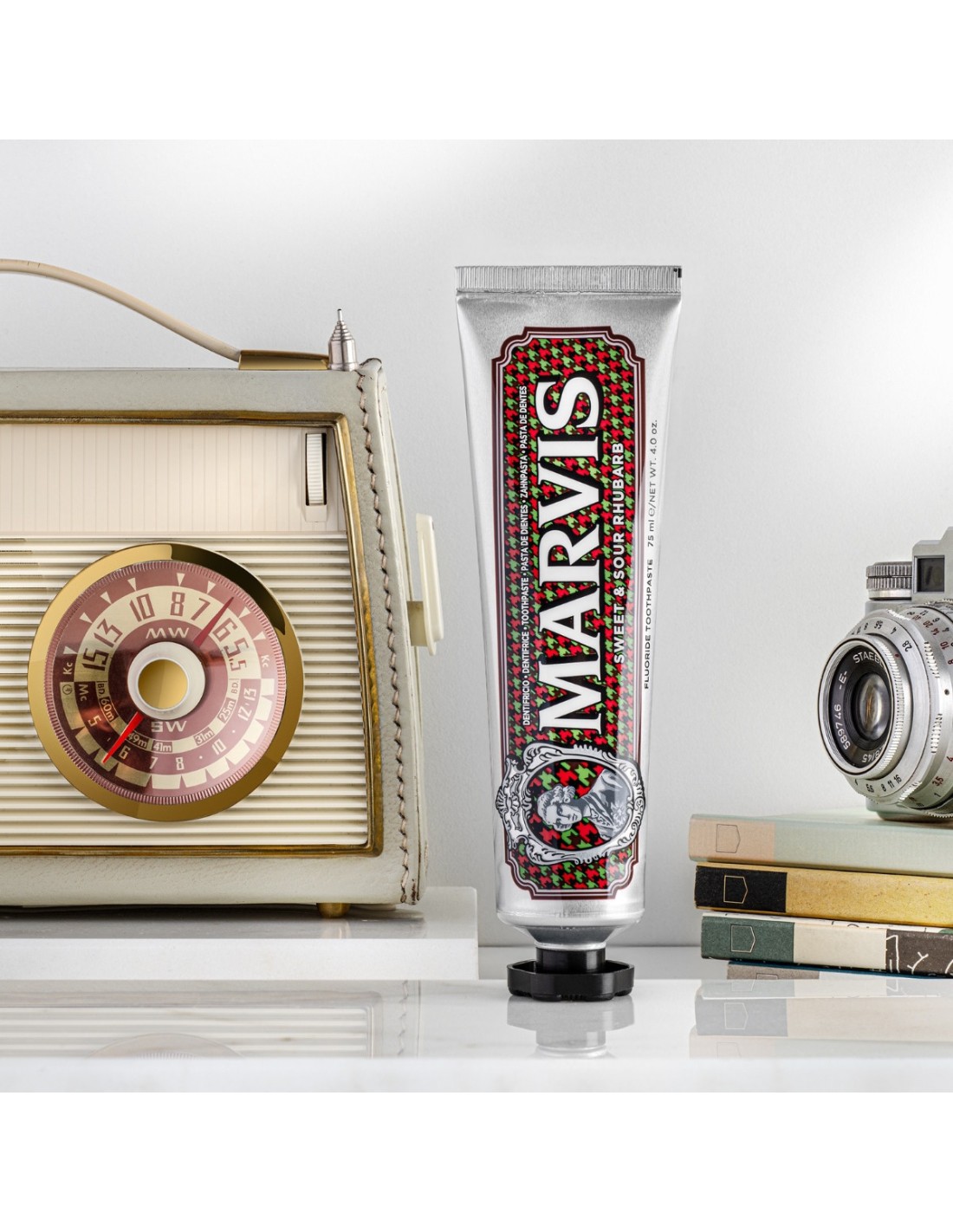 Marvis Sweet & Sour Rhubarb jedinstvena je pasta za zube koja spaja neobičan slatko-kiselkasti profil rabarbare s osvježavajućom mentom.