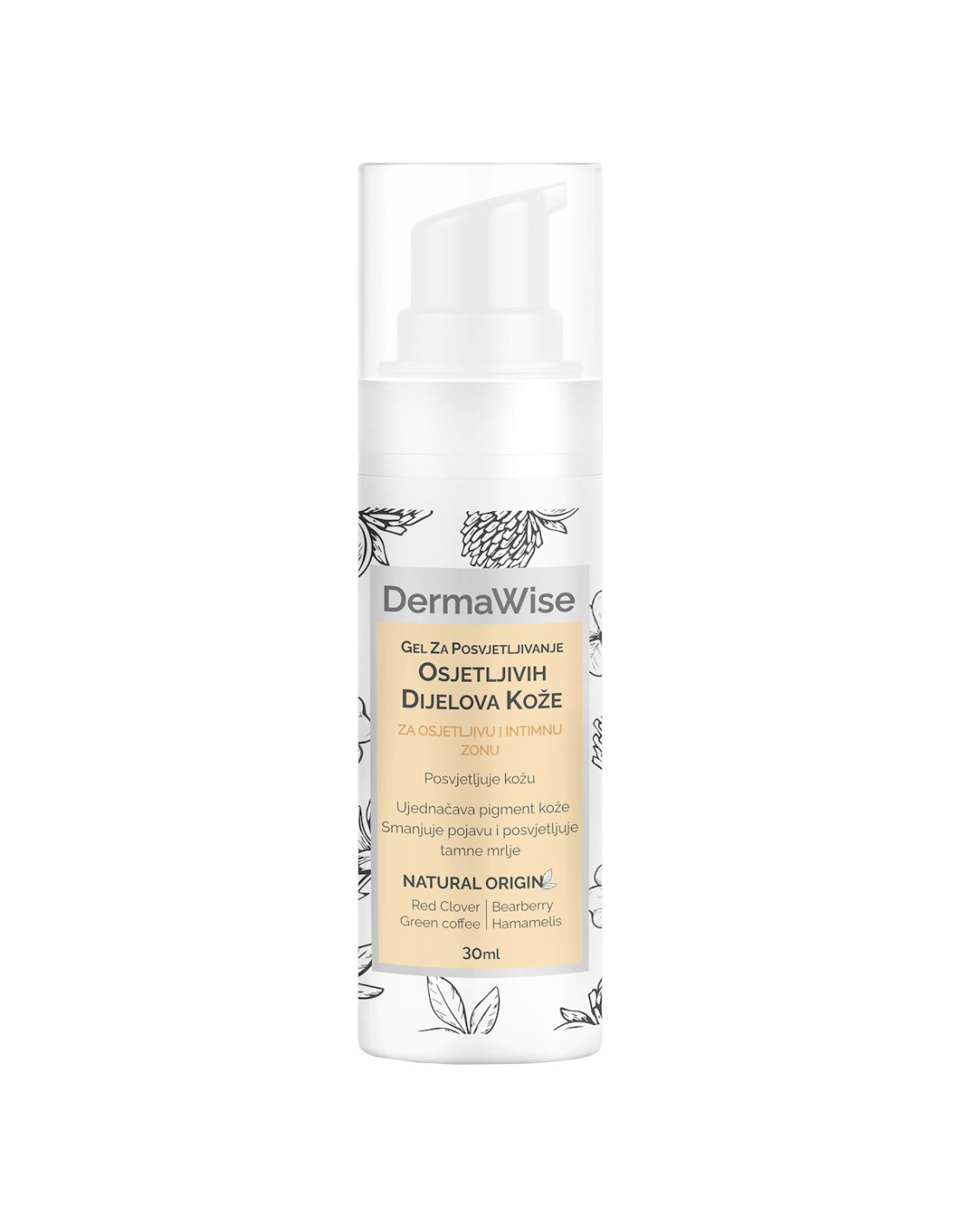 DermaWise Gel za posvjetljivanje osjetljivih dijelova kože namijenjen je nježnom posvjetljivanju vanjskog intimnog područja i drugih osjetljivih dijelova kože.Sadrži 98 % sirovina prirodnog porijekla. Formulacija koristi sinergiju ekstrakata medvjetke, crvene djeteline, hamamelisa i zelene kave — prirodnih izvora arbutina, biochanina A i klorogenične kiseline.