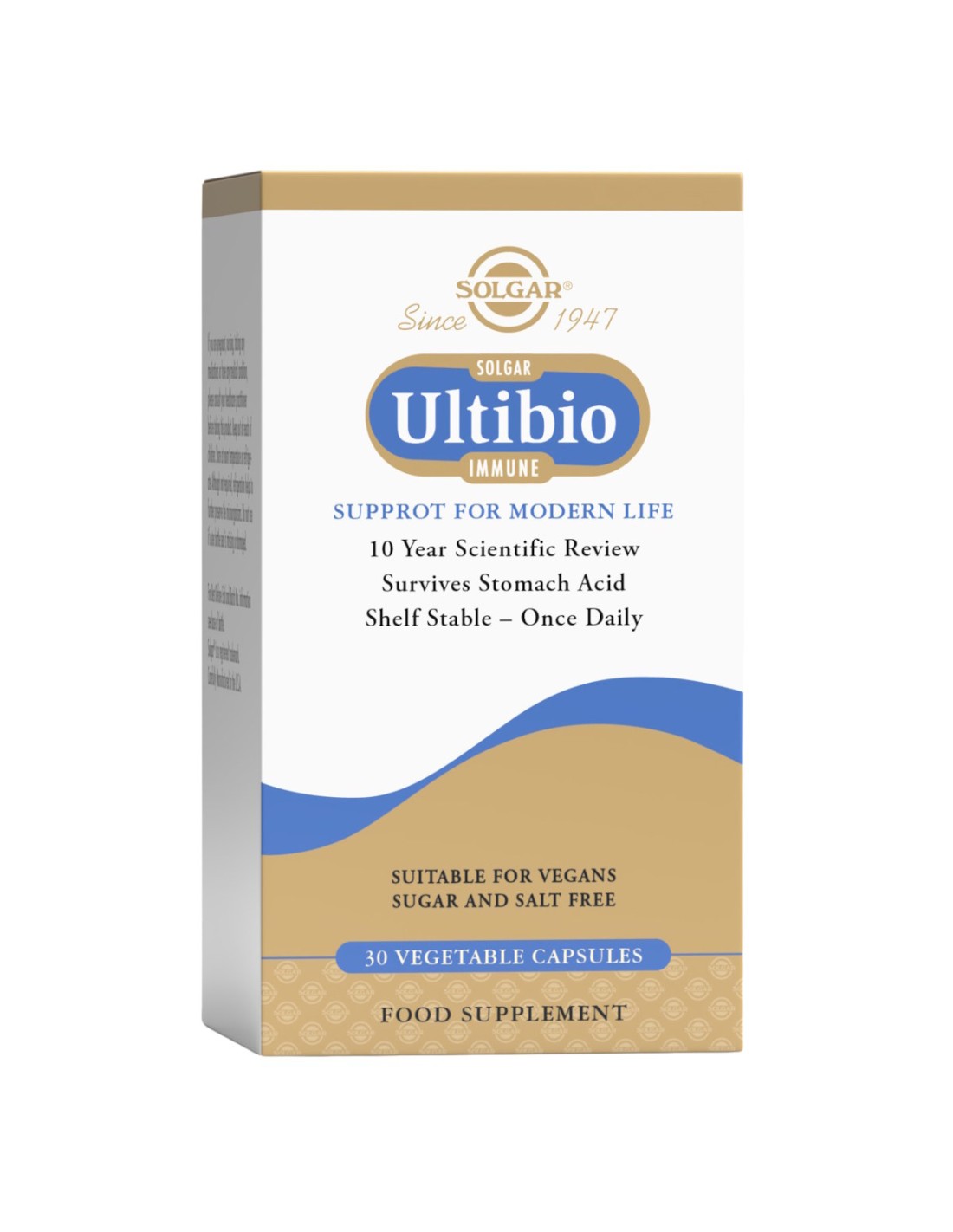 Solgar Ultibio Immune je nova, sinergijska formulacija koja sadrži dva jedinstvena, patentirana, pH stabilna i klinički testirana soja bakterijskih kultura, Lactobacillus plantarum HEAL9 i Lactobacillus paracasei 8700:2, te tri različita nutrijenta koja doprinose normalnoj funkciji imunosnog sustava - vitamin D3, metilkobalamin (vitamin B12) i vitamin A.