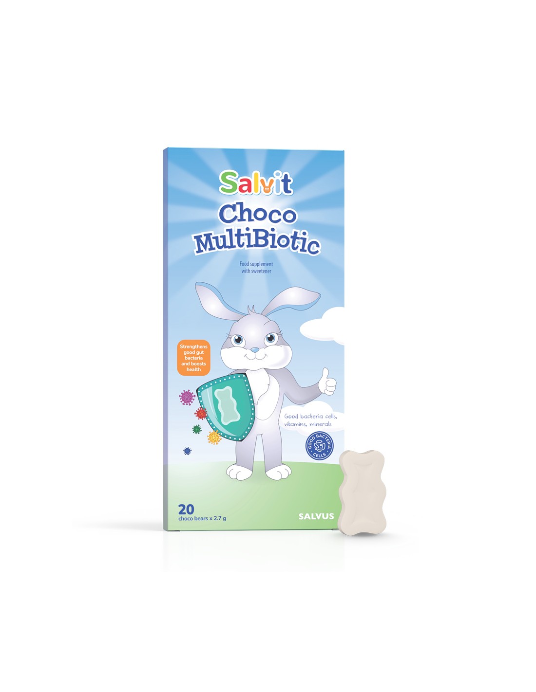 Salvit Choco MultiBiotic čokoladni medvjedići su dodatak prehrani u obliku ukusnih čokoladnih medvjedića s okusom kokosa i banane, namijenjen djeci od 3 godine i odraslima. Ovaj proizvod kombinira postbiotik Lactobacillus rhamnosus CRL1505 s devet vitamina i tri minerala, pružajući podršku imunološkom sustavu i općem zdravlju.