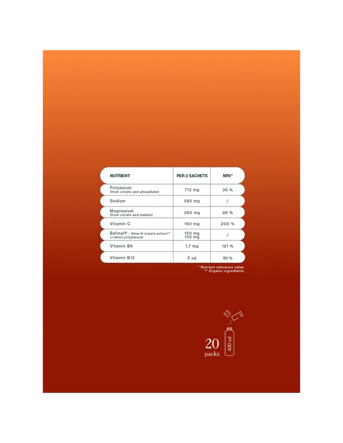 Sastav: Regulator kiselosti (limunska kiselina), magnezijev citrat, natrijev klorid, kalijev citrat, monokalijev fosfat, magnezijev malat, bojilo (koncentrat cikle (Beta vulgaris), ekstrakt ljubičaste borovnice), prirodne arome, vitamin C (L-askorbinska kiselina), Belinal (ekstrakt bijele jele – Abies alba), sladilo: sukraloza, vitamin B6 (piridoksin hidroklorid), vitamin B12 (cijanokobalamin).