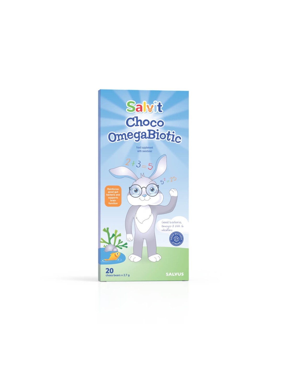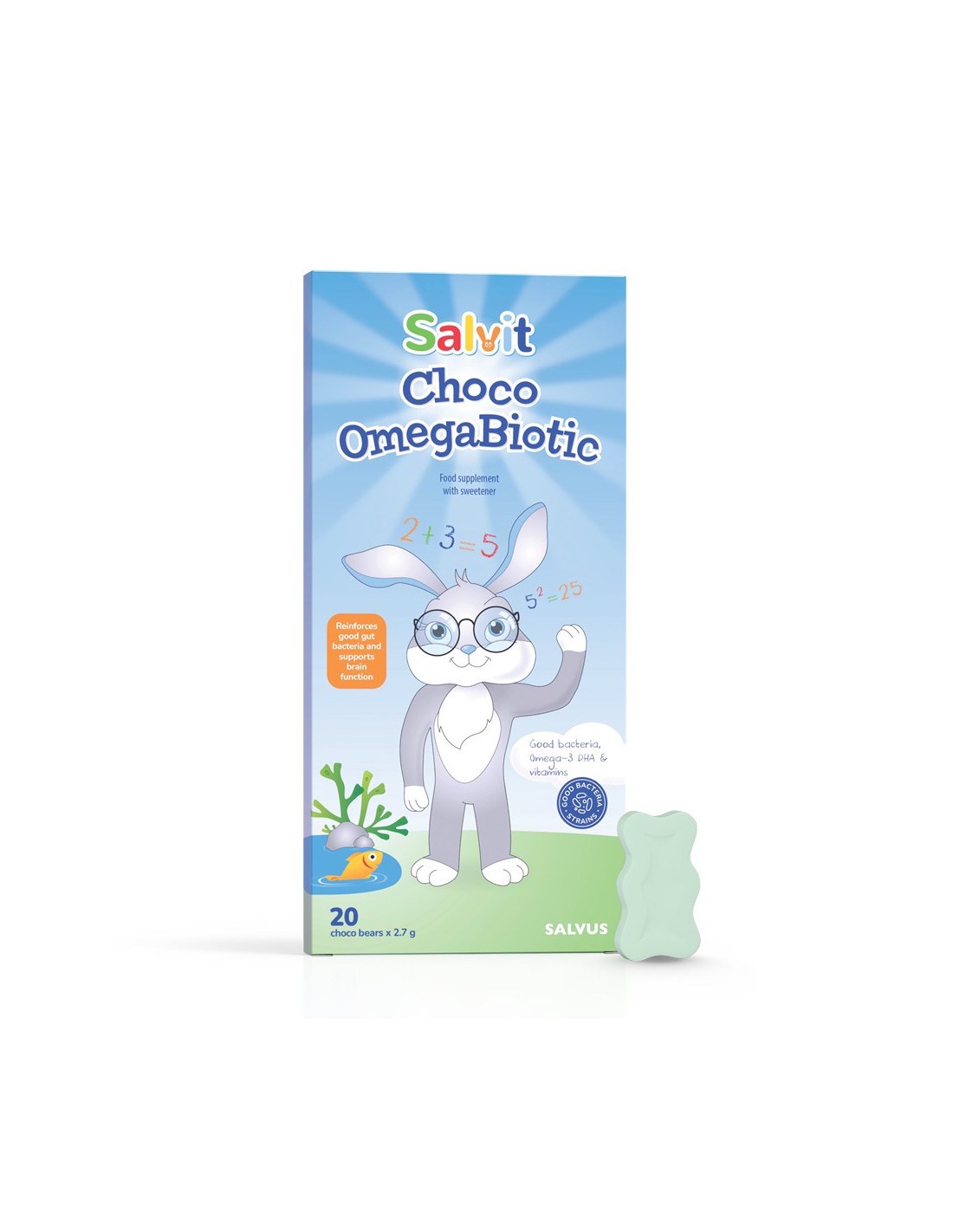 Salvit Choco OmegaBiotic čokoladni medvjedići su dodatak prehrani namijenjen djeci od 3 godine i odraslima, osmišljen za podršku zdravlju mozga, srca i crijevne mikrobiote. Ovaj proizvod kombinira omega-3 masne kiseline, probiotike i vitamine D i E, a dolazi u obliku ukusnih čokoladnih medvjedića s okusom žvakaće gume.