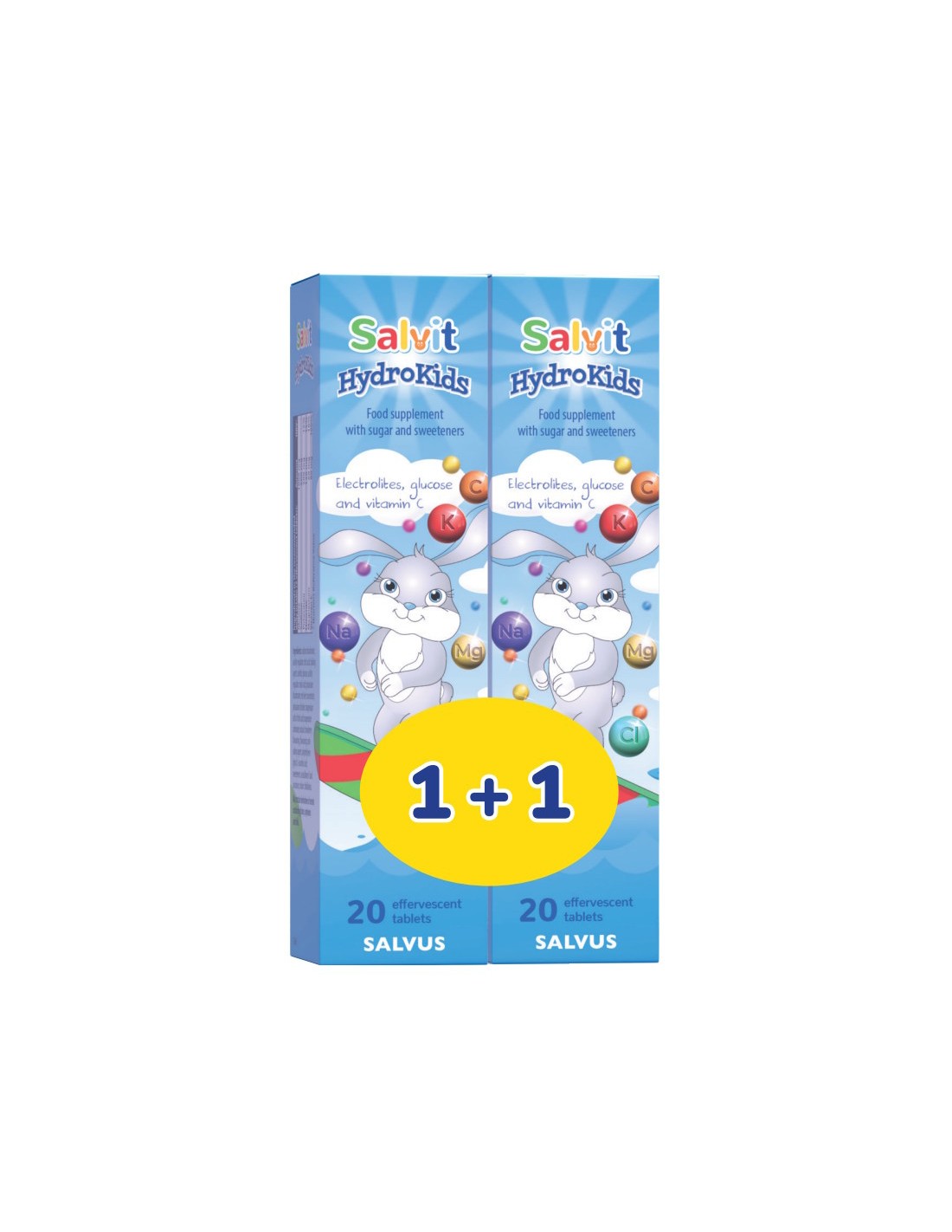 Salvit HydroKids, dodatak prehrani sa šećerom i zaslađivačem namijenjen je za nadoknadu elektrolita nakon fizičke aktivnosti, tijekom vrućeg vremena ili bolesti. Obogaćen vitaminom C, dodatno pruža potporu imunitetu. 1+1 Promo pakiranje.