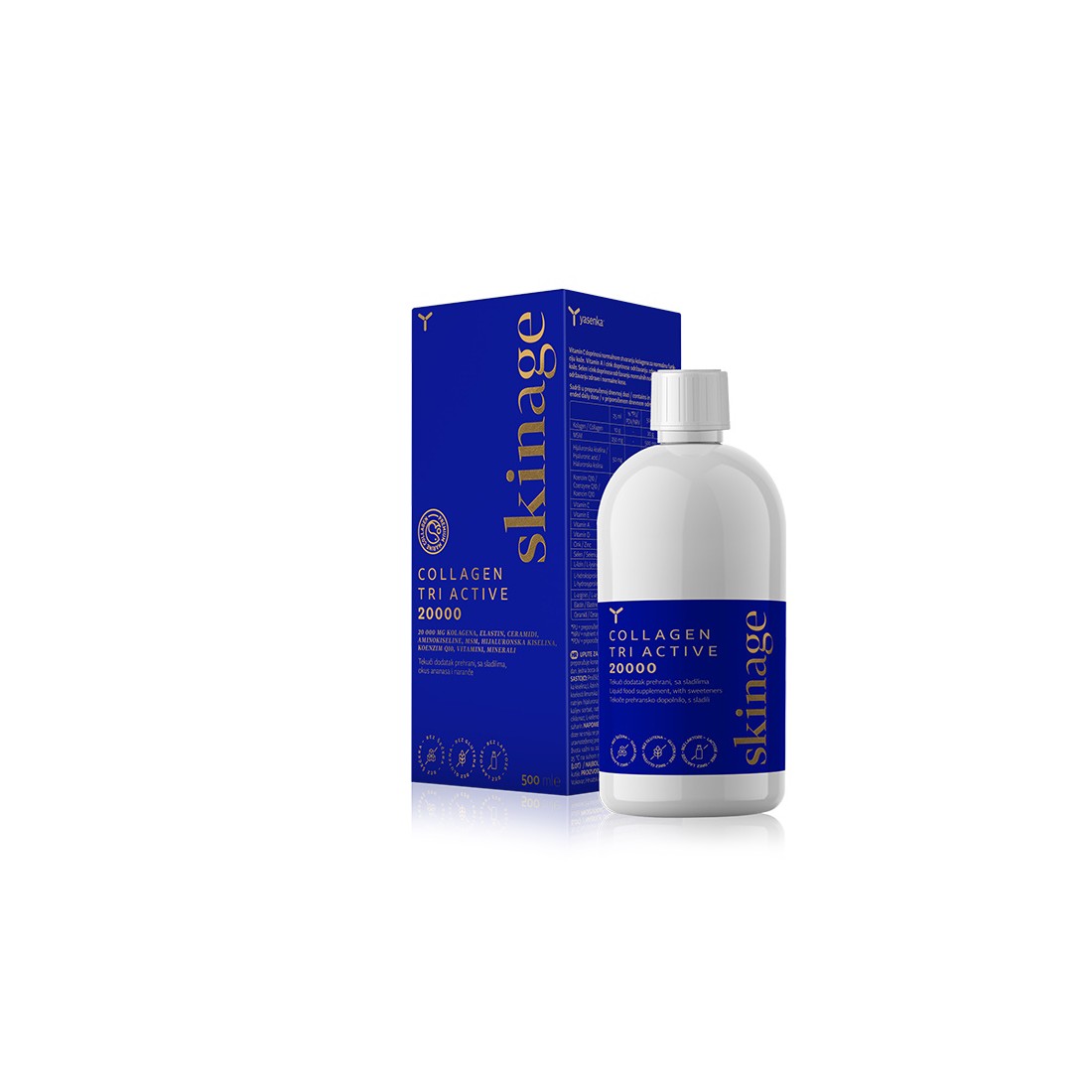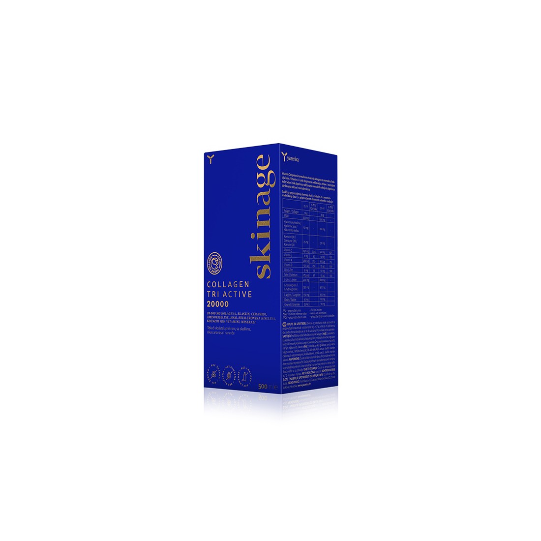 Sastav: Pročišćena voda; hidrolizirani morski kolagen (riblji); L-askorbinska kiselina; L-lizin hidroklorid; L-hidroksiprolin; metilsulfonilmetan; regulator kiselosti: limunska kiselina; L-arginin; koenzim Q10; aroma ananasa i naranče; natrijev hijaluronat; elastin (riblji); ceramidi; cinkov glukonat; konzervansi: kalijev sorbat, natrijev benzoat; DL-alfa-tokoferil acetat; sladilo: natrijev ciklamat; L-selenometionin; kolekalciferol; retinil acetat; sladilo: natrijev saharin.