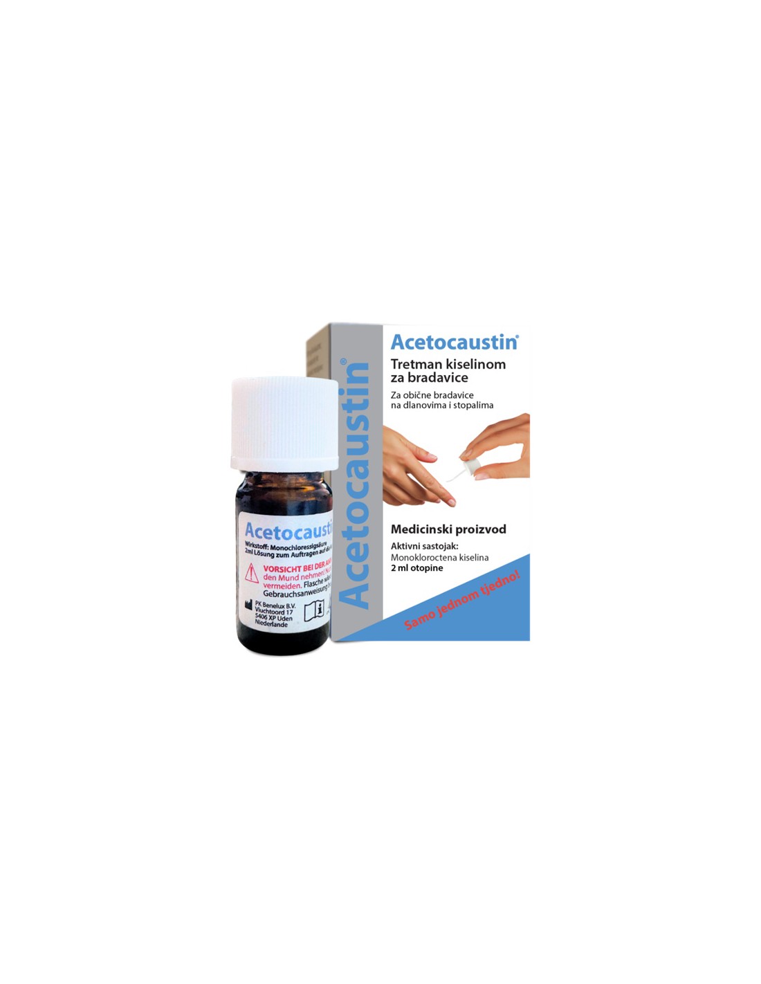 Acetocaustin tretman kiselinom za bradavice sadrži monokloroctenu kiselinu, tvar koja ima keratolitički učinak na kožu.
