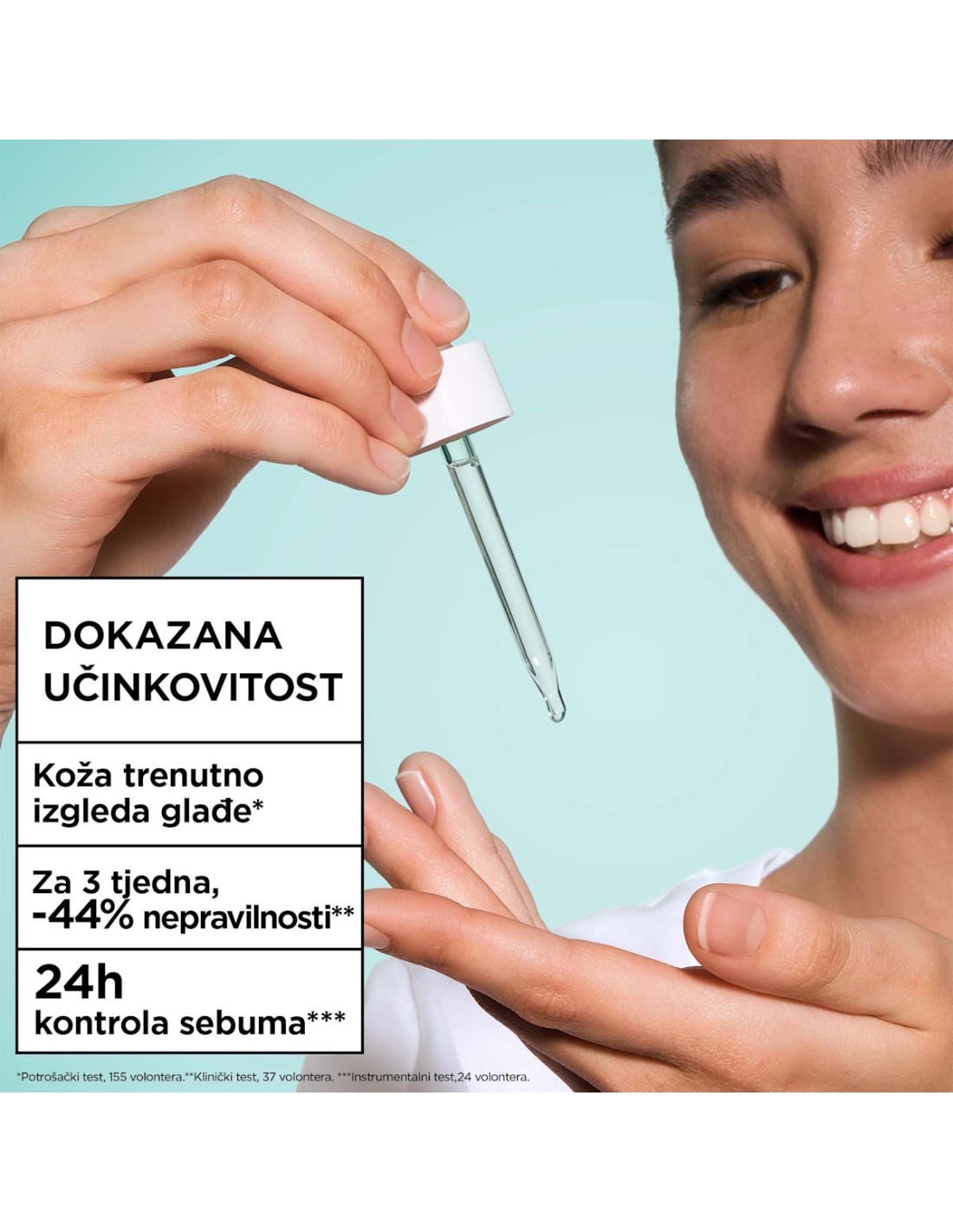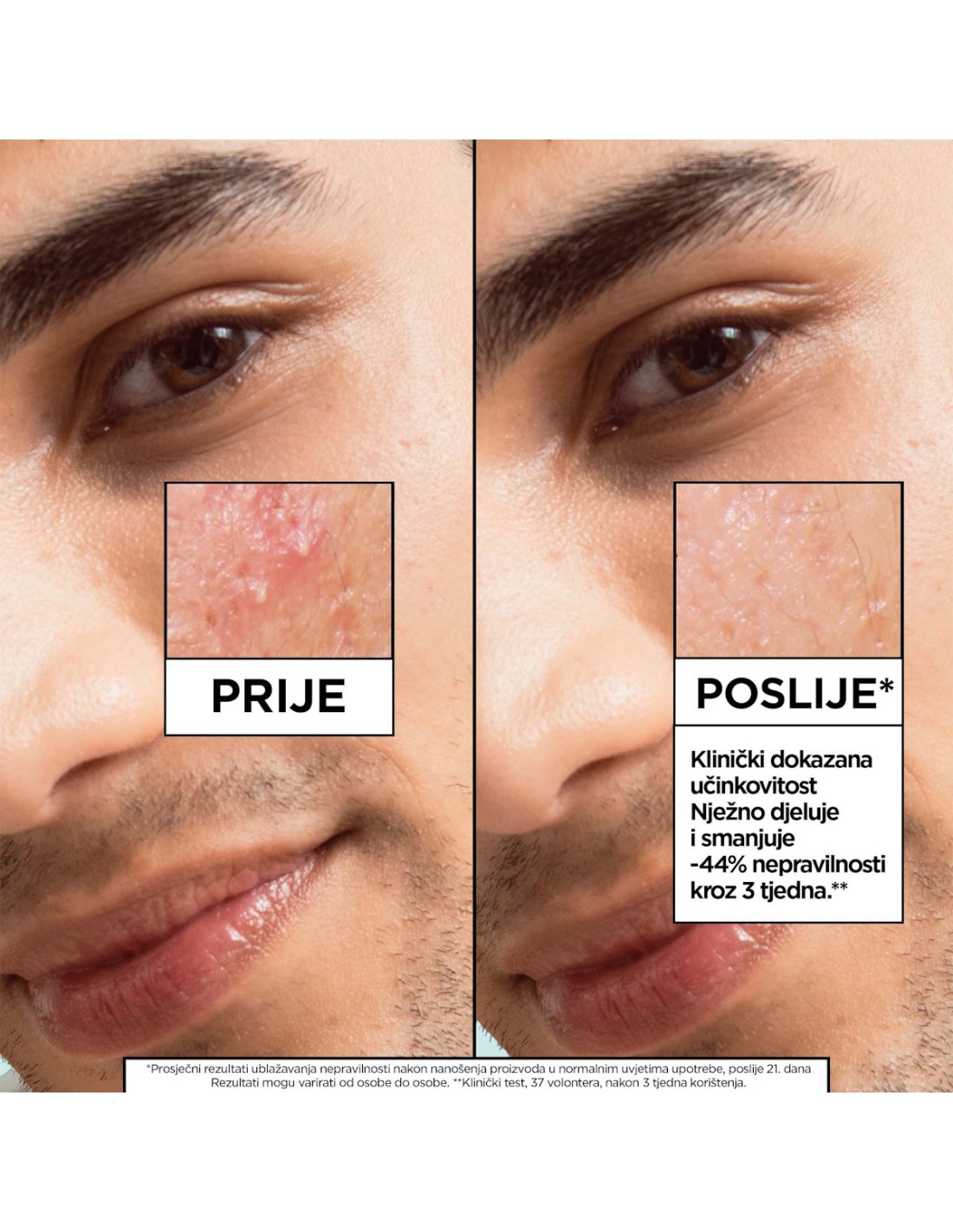Klinički dokazani rezultati: Za 7 dana, -18% nepravilnosti*. Za 2 tjedna, -27% nepravilnosti*. Za 3 tjedna, -44% nepravilnosti*. Dokazana učinkovitost: Koža je trenutno osjećaj glatkom**.