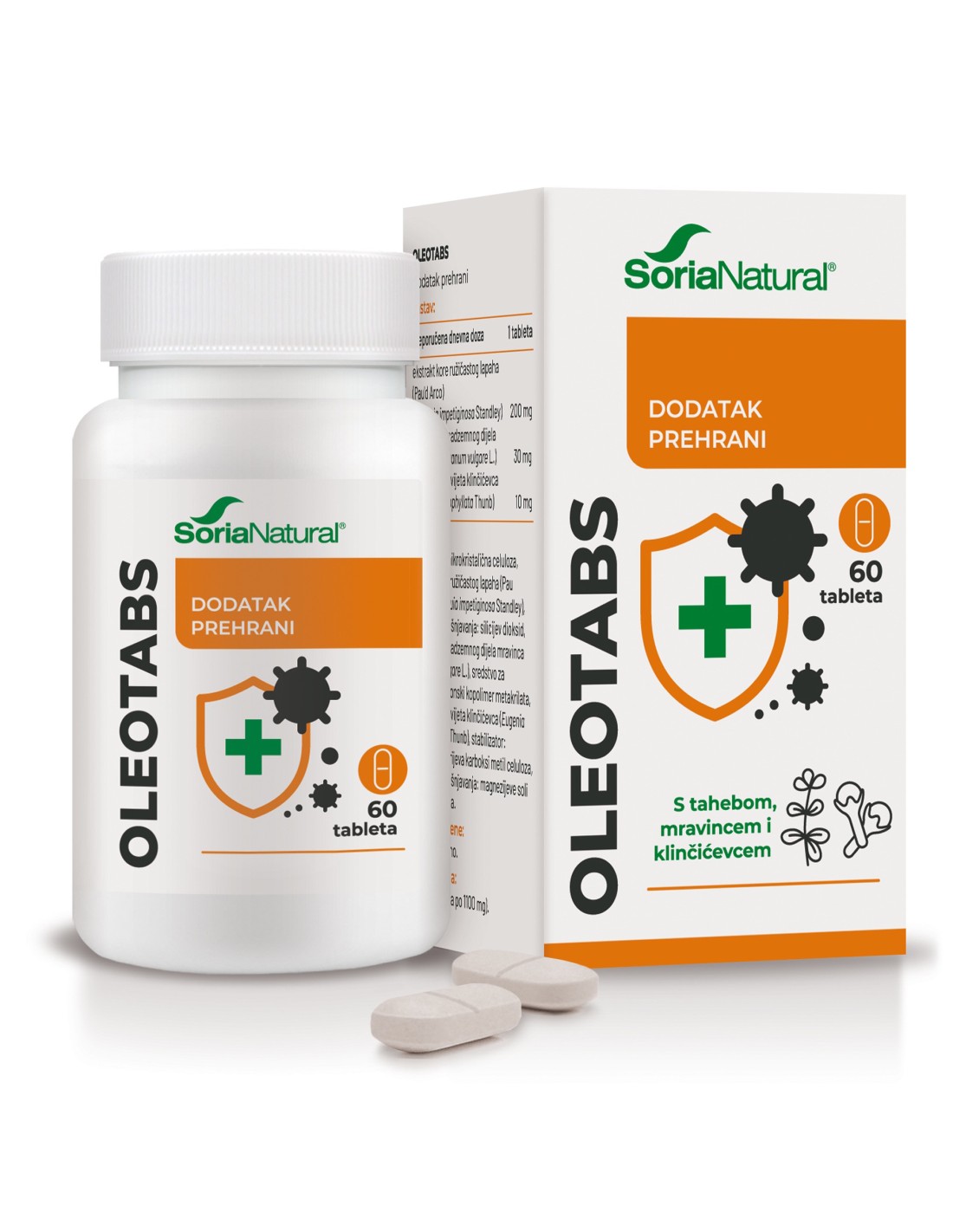 Oleotabs gastrorezistentne tablete – sadrže ekstrakt kore ružičastog lapaha (Pau’d Arco) (Tabebuia impetiginosa Standley), eterično ulje nadzemnog dijela mravinca (Origanum vulgare L.) i eterično ulje cvijeta klinčićevca (Eugenia caryophyllata Thunb).