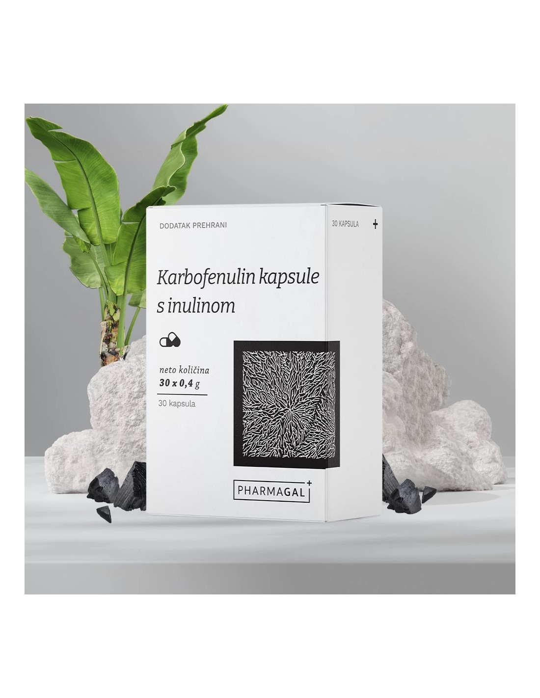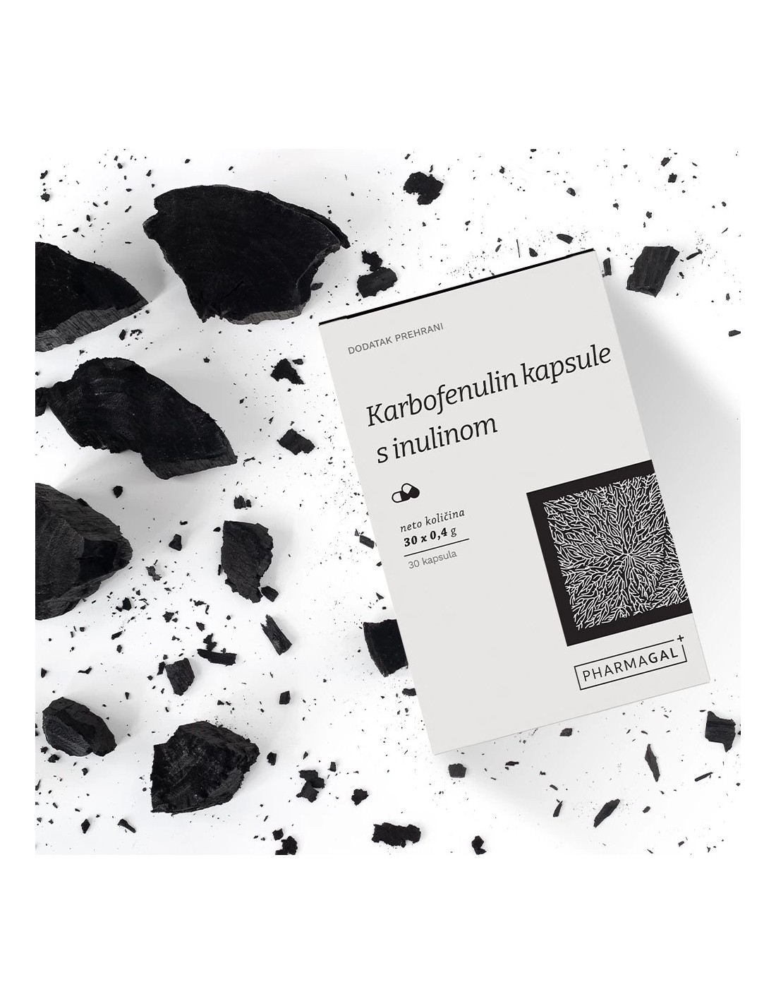 Sastav: aktivni ugljen, inulin, tvar za sprječavanje zgrudnjavanja: magnezijeve soli masnih kiselina (E470b), celulozna kapsula