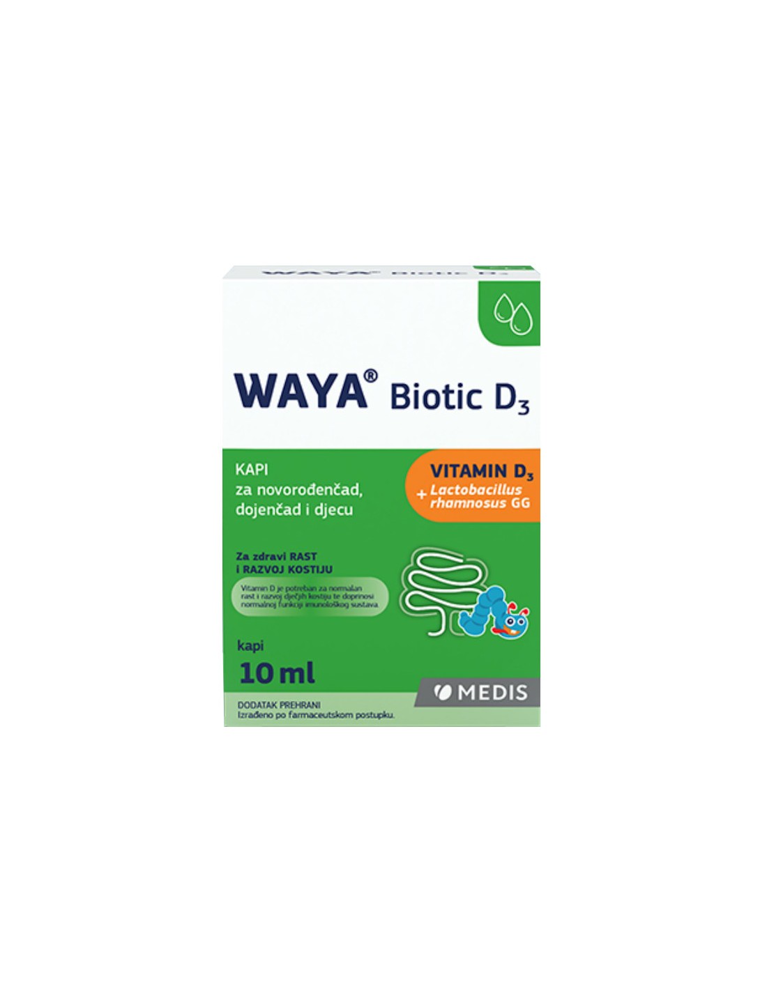 WAYA® Biotic D3 kapi za novorođenčad, dojenčad i djecu za uravnoteženu crijevnu mikrofloru jedine sadrže mikroenkapsuliranu korisnu mliječnokiselinsku bakteriju Lactobacillus rhamnosus GG i vitamin D3 u uljnoj suspenziji. WAYA® Biotic D3 kapi brinu se za odgovarajući unos vitamina D3 koji je potreban za normalan rast i razvoj kostiju te doprinosi normalnoj funkciji imunološkog sustava.