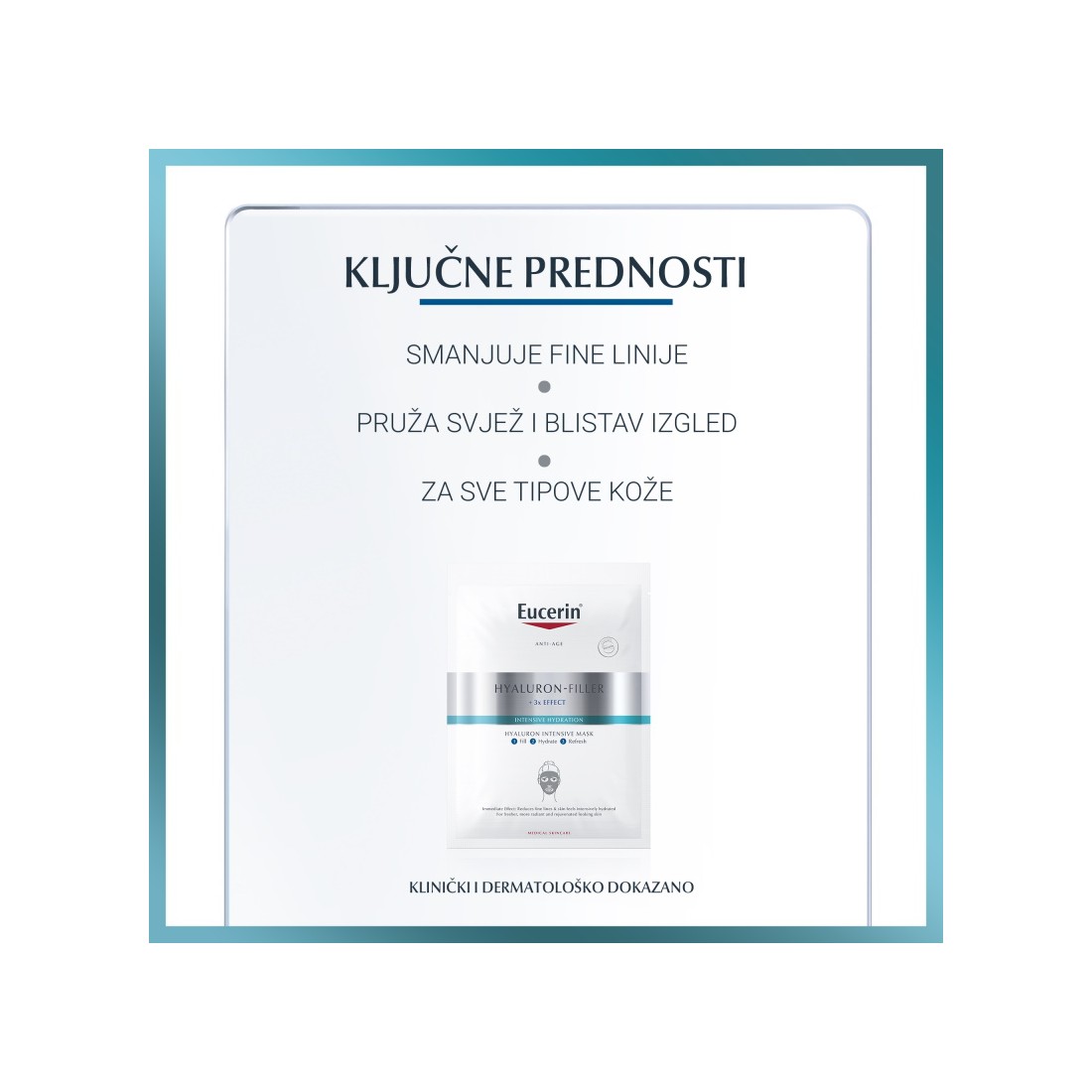 Eucerin Hyaluron-Filler anti-age maska za intenzivnu hidrataciju klinički i dermatološki dokazano pruža izvrsne rezultate, hladi kožu, smanjuje fine linije i ostavlja kožu sjajnom, svježom, blistavom i pomlađenom.