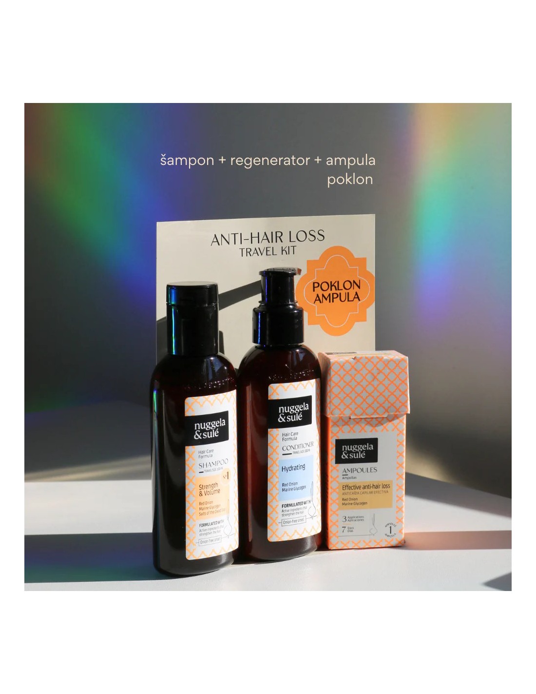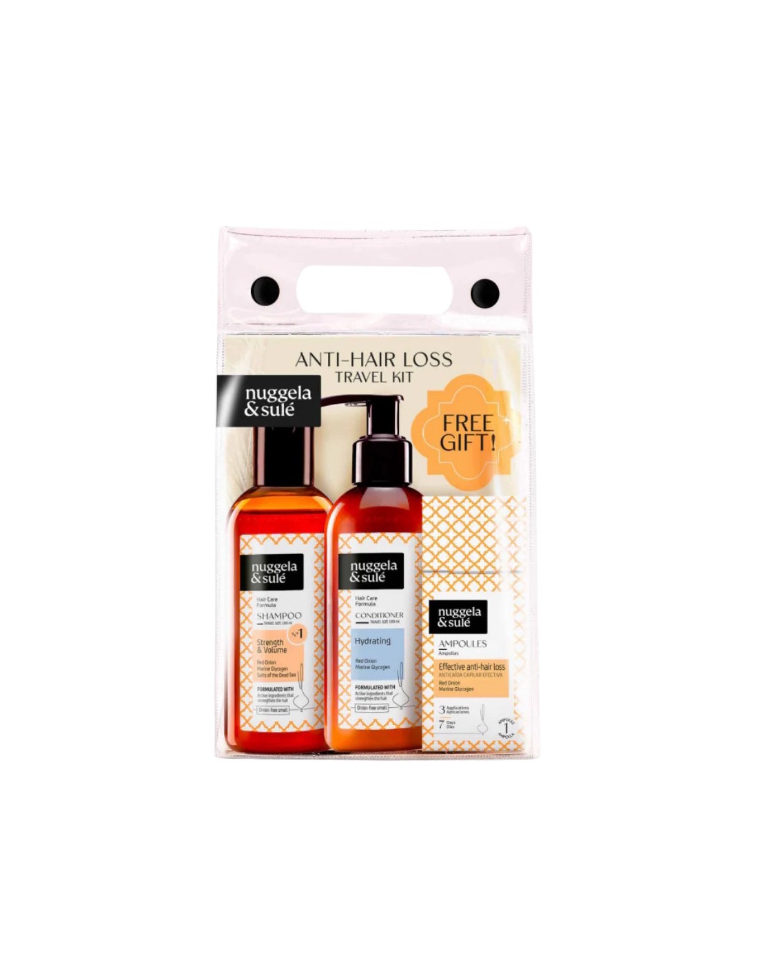 Praktični putni set koji sadrži mini verziju Nº1 Šampona, Regeneratora i kao poklon, jednu ampulu protiv opadanja kose.