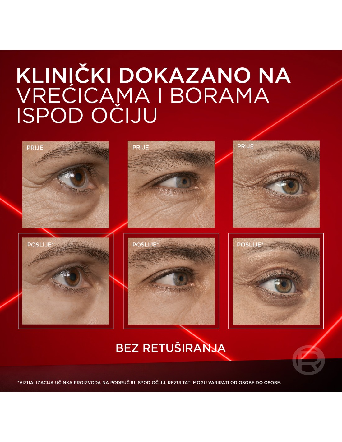 "KLINIČKI DOKAZANI REZULTATI: 95% žena primjećuje smanjenje vrećica ispod očiju**, a 94% žena potvrđuje da im područje oko očiju izgleda glađe, čvršće i podignutije**.