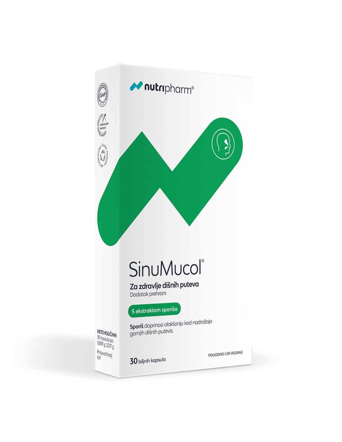 Nutripharm® SinuMucol® kapsule su dodatak prehrani za zdravlje dišnih puteva. Svaka kapsula sadrži 600 mg N-acetilcisteina obogaćenog bromelainom i ekstraktom sporiša (Verbena officinalis L.) i čini inovativnu kombinaciju sinergijskog učinka.