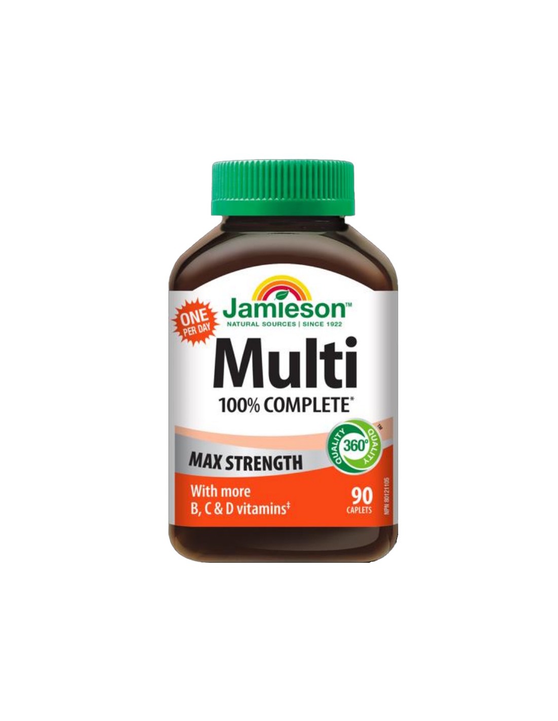 Jamieson 100% Complete Multivitamin Max Strength je premium multivitamin za odrasle koji sadrži 100% ili više preporučenog dnevnog unosa ključnih vitamina i minerala.