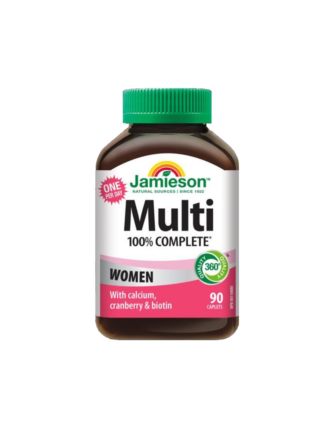 Jamieson 100% Complete Multivitamin for Women je premium formuliran multivitamin za odrasle žene koji pruža 100 % ili više preporučenog dnevnog unosa ključnih vitamina i minerala.
