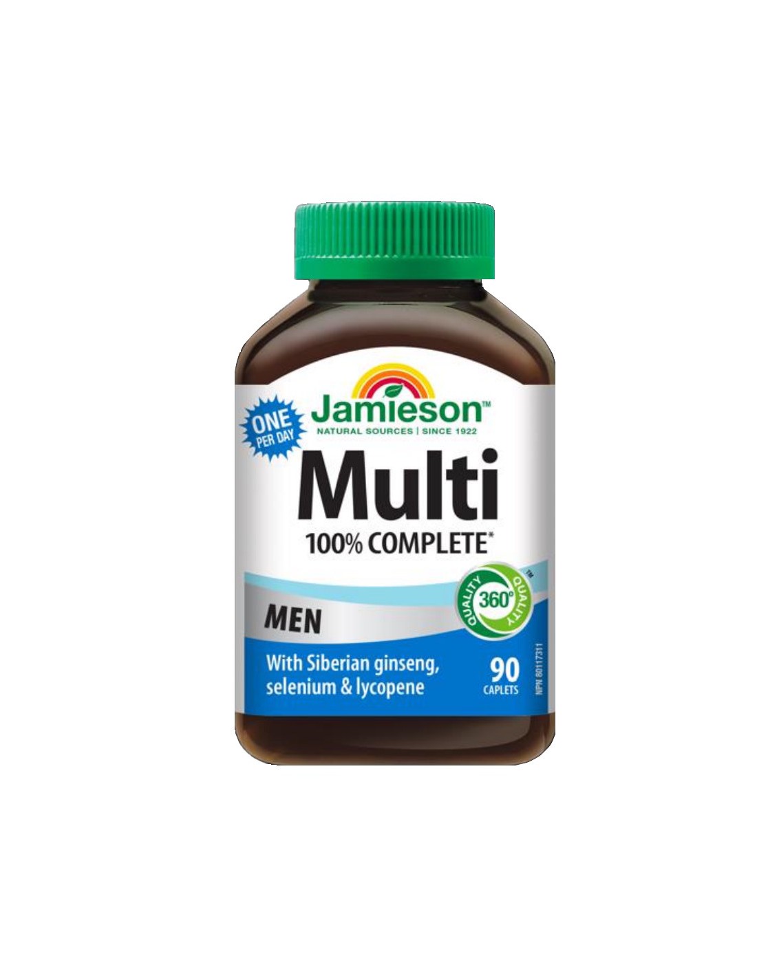 Jamieson 100% Complete Multivitamin for Men je premium multivitamin formuliran posebno za odrasle muškarce, koji osigurava 100 % ili više preporučenog dnevnog unosa ključnih vitamina i minerala.