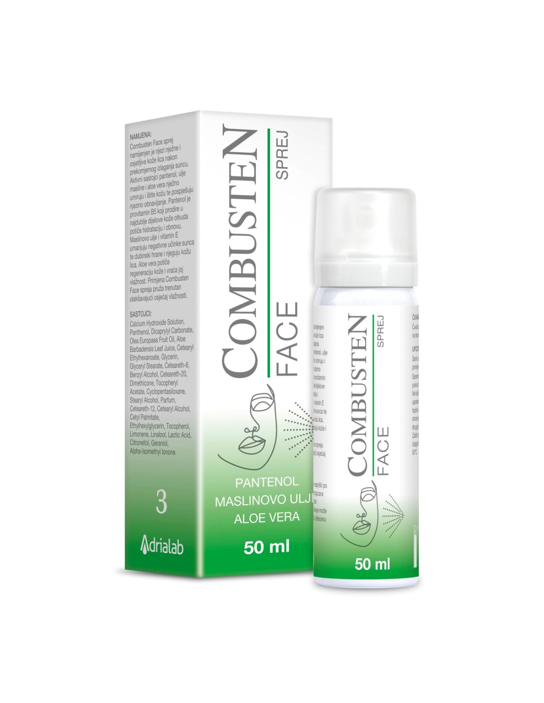 Combusten Face sprej sadrži jedinstvenu kombinaciju kalcijevog hidroksida, visoki udio pantenola, aloe vere i maslinovog ulja koji provjereno rješavaju probleme iritirane kože lica, bez narušavanja prirodne kožne barijere.