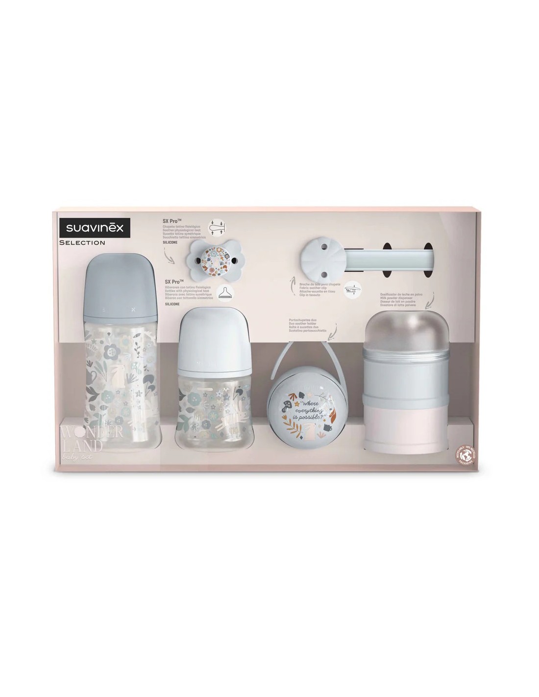 Suavinex Wonderland poklon set plava osmišljen je kao praktičan komplet za prve mjesece s bebom. Sadrži dvije bočice, dudu, posudu za mlijeko u prahu i dodatke u usklađenim plavim motivima. Ako tražiš poklon set za bebu ili poklon za novorođenče u klasičnim „baby boy“ nijansama, ovaj set je odličan izbor.