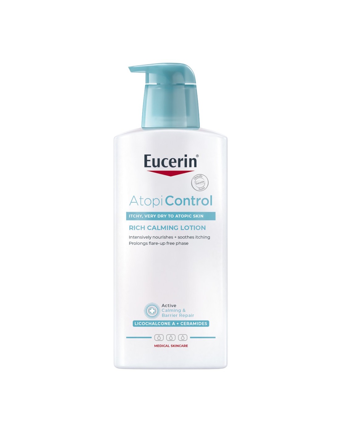 Eucerin AtopiControl losion za tijelo sadržava kombinaciju koncentriranih omega-6 masnih kiselina (ulje noćurka i ulje sjemenki grožđa) i umirujućeg licochalcona A (ekstrakta korijena sladića) koja obnavlja kožu, pomaže u vraćanju njenog prirodnog zaštitnog sloja te je čini otpornijom. Nanijeti jednom ili dvaput dnevno ili koristiti kao dopunsku njegu uz korištenje Eucerin AtopiControl Akut kreme za njegu kože sklone crvenilu tijekom akutne faze.