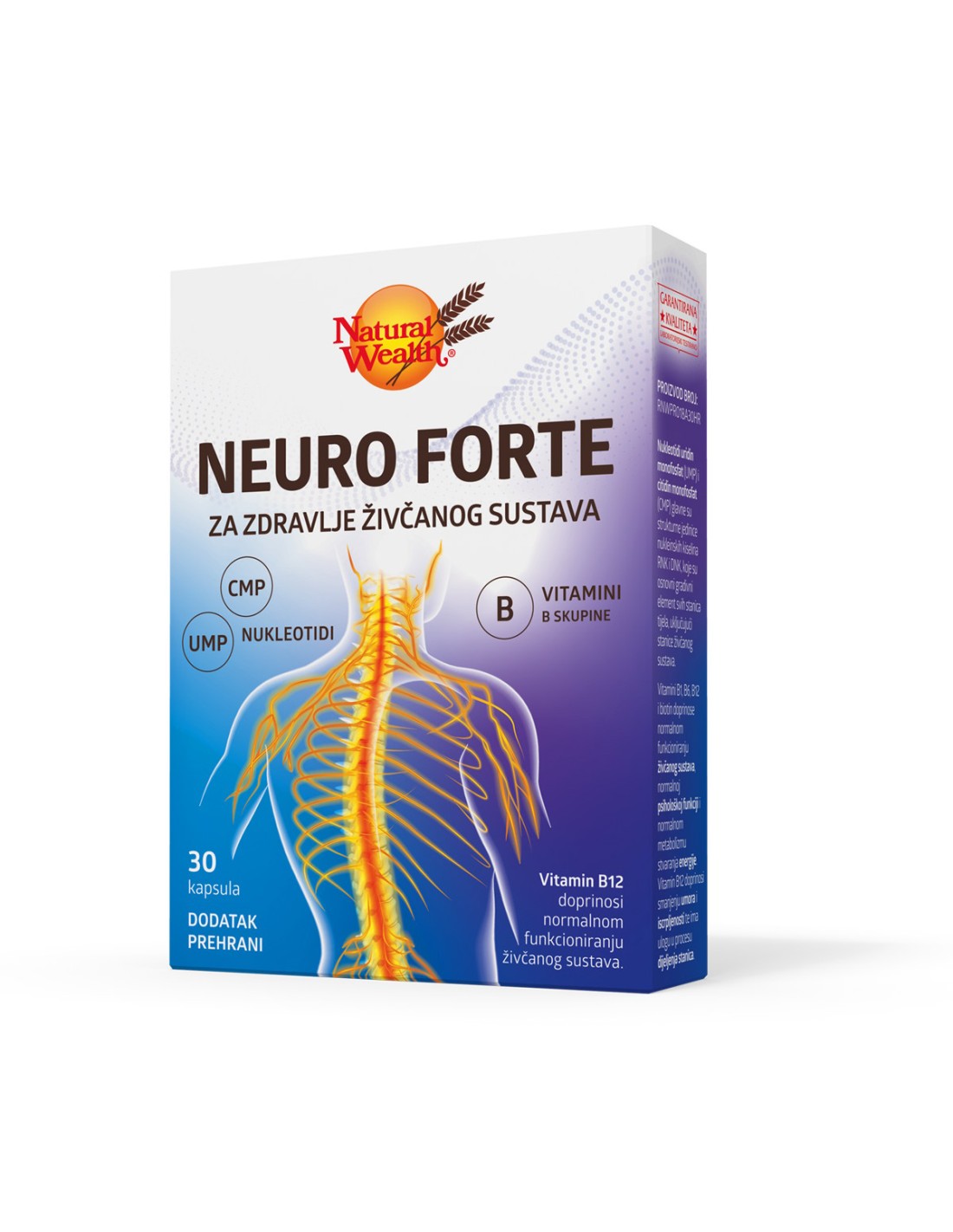 Zahvaljujući sinergijskoj kombinaciji visokih doza vitamina B skupine, kolina te nukleotida uridin 5'-monofosfata (UMP) & citidin 5'-monofosfata (CMP), Natural Wealth® Neuro Forte doprinosi zdravlju živčanog sustava, normalnoj psihološkoj funkciji i bržem stvaranju energije.