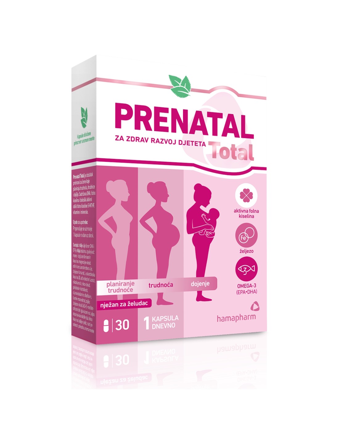 Prenatal Total je dodatak prehrani koji sadrži aktivnu folnu kiselinu, DHA i EPA te pažljivo odabrane vitamine i minerale za optimalnu podršku zdravlju majke i pravilan razvoj djeteta.
