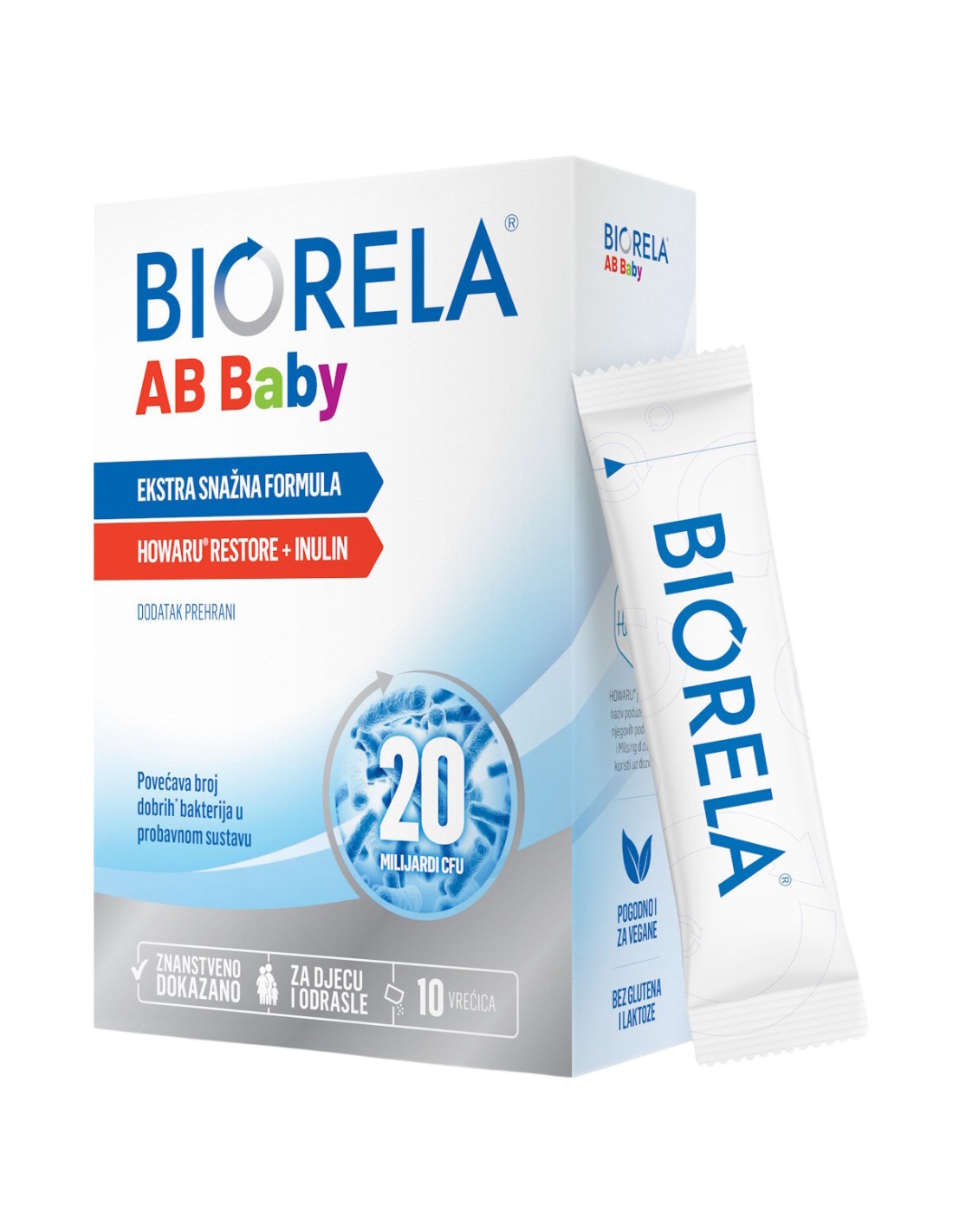 Biorela® AB Baby je dodatak prehrani za povećanje broja dobrih* bakterija u probavnom sustavu pogodan za djecu već od dojenačke dobi.