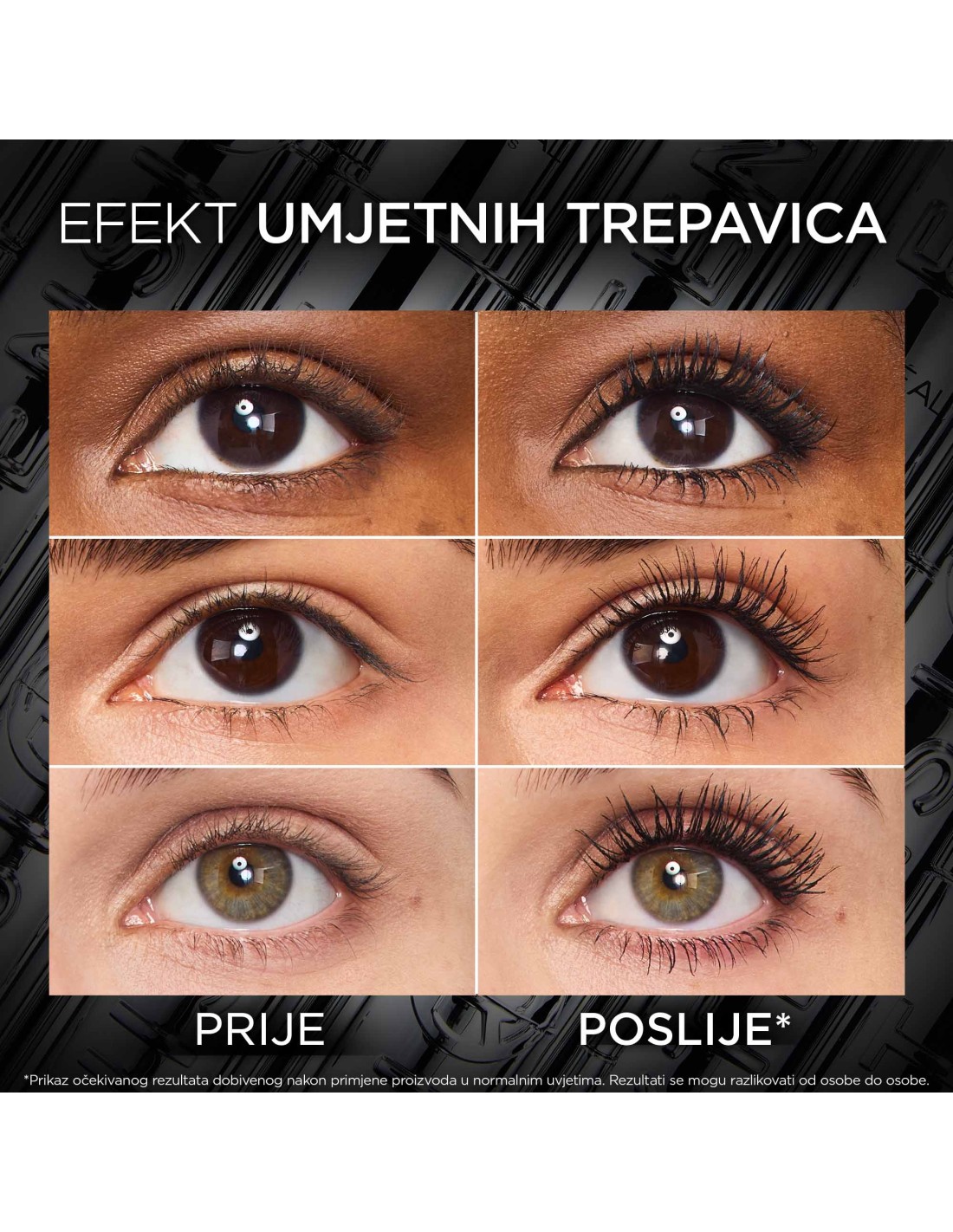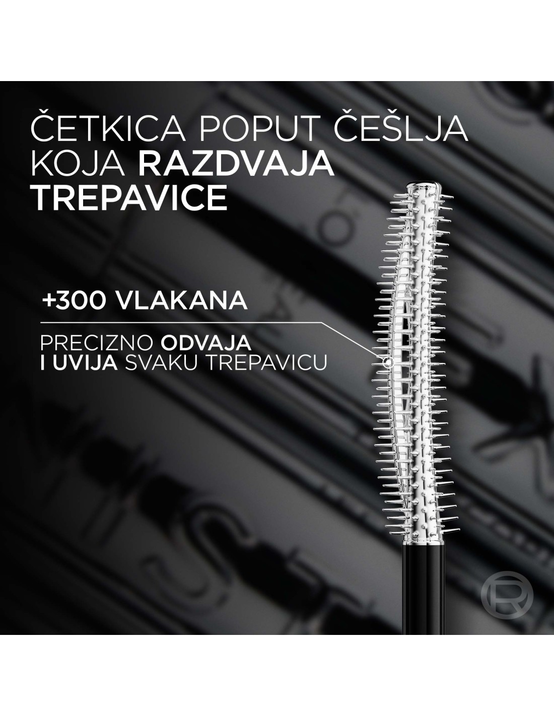 Formula s magnetski crnim pigmentima i vlaknima produljuje trepavice, podižući ih do 5 mm* bliže obrvama, dok precizna četkica s preko 300 dlačica osigurava definiran izgled bez grudica.