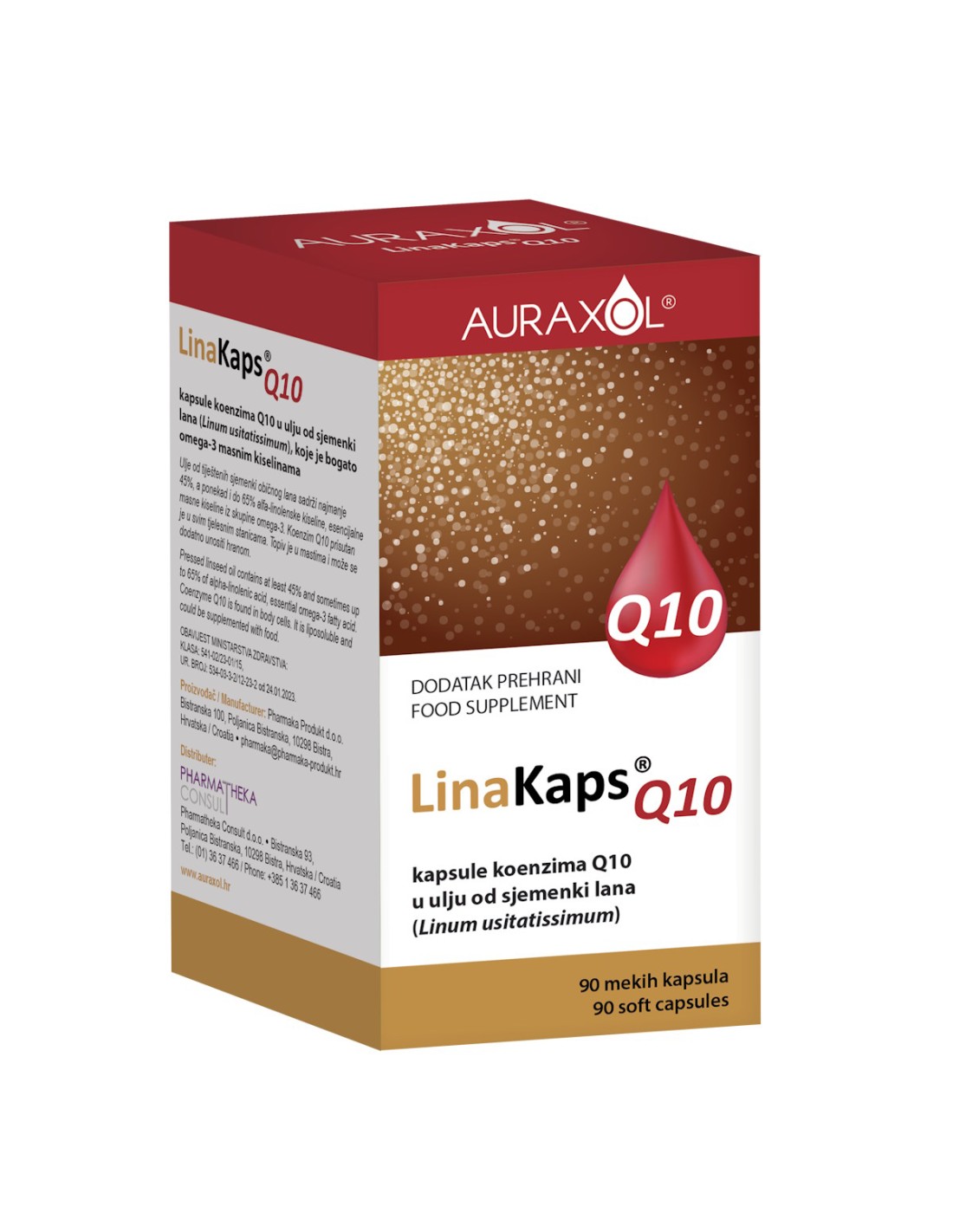 LinaKaps Q10 je funkcionalni dodatak prehrani u obliku mekih uljnih kapsula. Sadrži koenzim Q10 u ulju od sjemenki običnog lana. Koenzim Q10 je sastojak topiv u mastima. Uzimanje koenzima Q10 preporučuje se uvijek kada je u organizmu utvrđen njegov deficit. Koenzim Q10 ima važnu ulogu u proizvodnji energije, a koristi se u okviru nutritivne terapije i dijetetskih mjera. Alfa-linolenska kiselina iz ulja od sjemenki lana doprinosi održavanju normalne razine krvnih lipida, što predstavlja preventivnu mjeru kod bolesti srca i krvožilnog sustava. Koenzim Q10 može se uzimati kao potpora i dijetetski dodatak uz propisanu terapiju lijekovima za snižavanje razine kolesterola u krvi. Često se preporučuje u okviru nutritivne terapije za poboljšanje muškog i ženskog reproduktivnog zdravlja, osobito prije planirane trudnoće i pripreme za medicinski potpomognutu oplodnju. Zbog pojačanog trošenja koenzima Q10 kod većih tjelesnih napora, nadoknada putem dodataka prehrani preporučuje se sportašima i osobama koje obavljaju teže fizičke poslove.