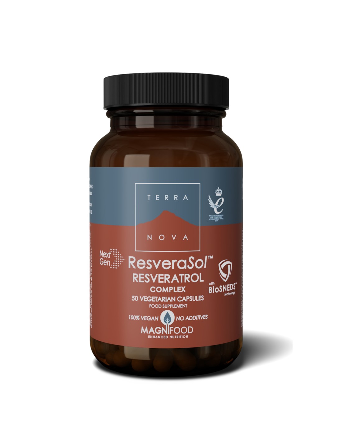 Terranova ResveraSol™ resveratrol kompleks sadrži patentiranu mješavinu BioSNEDS™ ResveraSol™, koja kombinira resveratrol dobiven iz prirodnog izvora – korijena japanskog dvornika – s inovativnom BioSNEDS™ tehnologijom. Ova tehnologija značajno povećava bioraspoloživost resveratrola, osiguravajući njegovu bolju apsorpciju i stabilnost u tijelu. Prema studijama, BioSNEDS™ ResveraSol™ pokazuje čak 43,3 puta veću bioraspoloživost u usporedbi sa standardnim resveratrolom te je 35 mg ovog oblika resveratrola ekvivalentno čak 1515,5 mg konvencionalnog resveratrola. Osim toga, ovakav oblik može smanjiti potencijalno negativan učinak metabolita resveratrola na stanice i funkcije jetre. Formulacija je dodatno obogaćena Magnifood kompleksom, sinergijskom mješavinom biljaka kao što su fermentirana kurkuma, aronija, matcha zeleni čaj, stabilizirane rižine mekinje i list peršina. Ovi sastojci prirodno doprinose antioksidativnoj zaštiti i protuupalnoj ravnoteži, podržavajući djelovanje resveratrola.