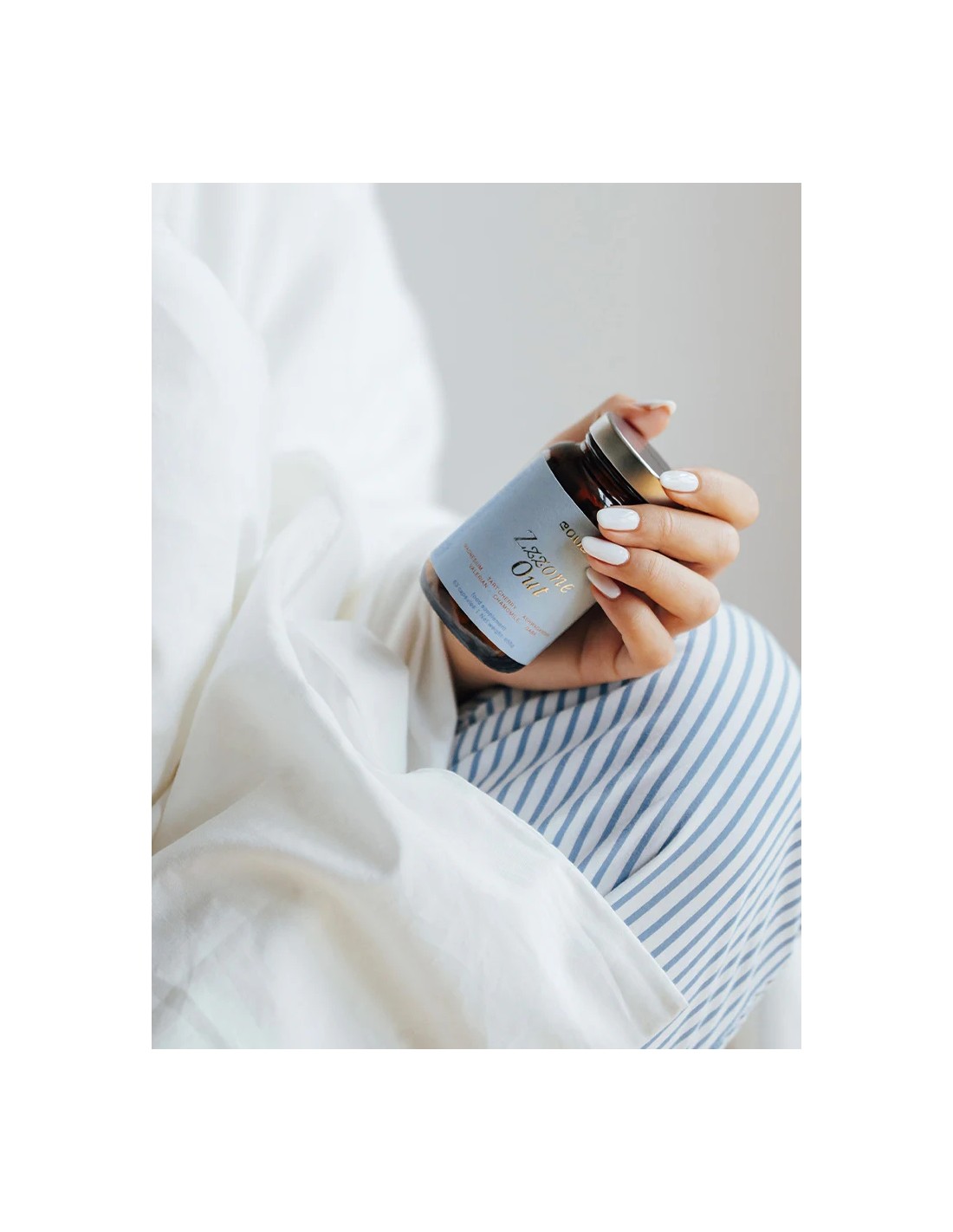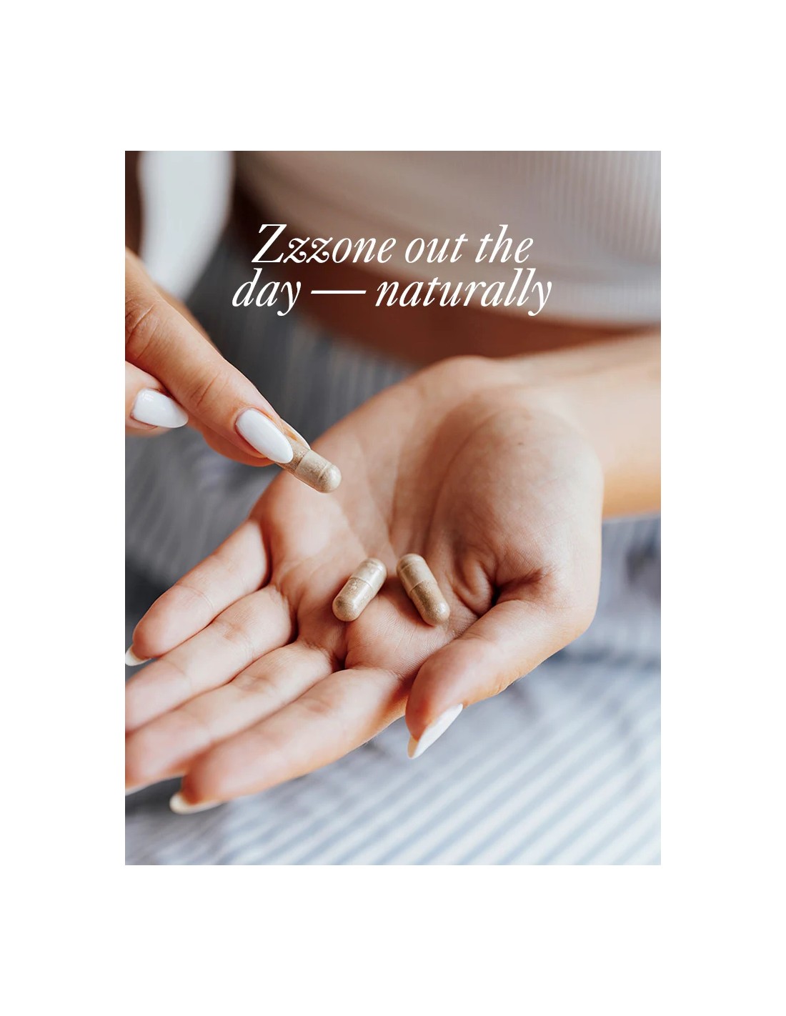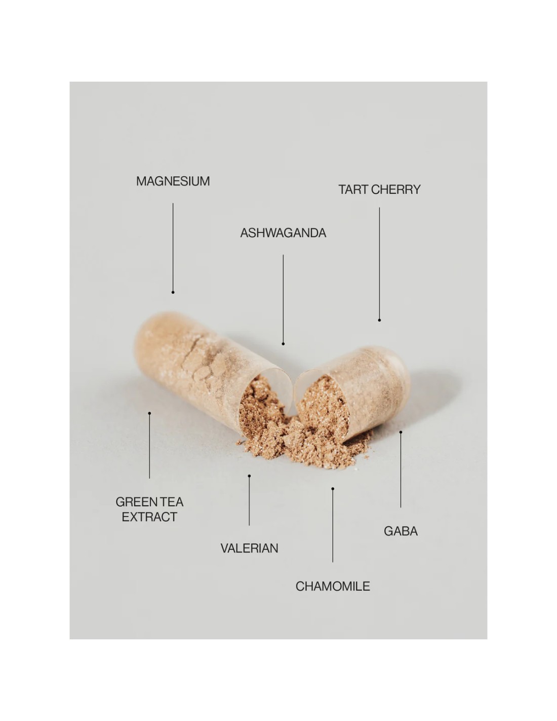 Sastav: Magnezijev malat, Ekstrakt cvijeta kamilice (Matricaria recutita), Suhi ekstrakt lista zelenog čaja (Camellia sinensis), CherryPure® [prašak ploda višnje montmorency (Prunus cerasus)], Ekstrakt korijena ašvagande (Withania somnifera), Ekstrakt korijena valerijane (Valeriana officinalis), Gama-aminomaslačna kiselina (GABA)