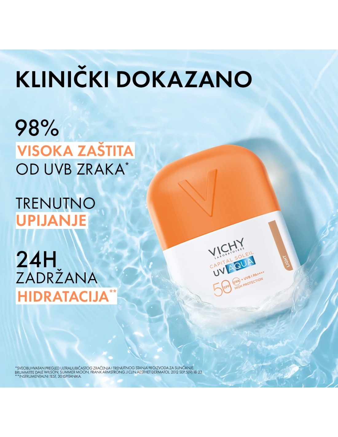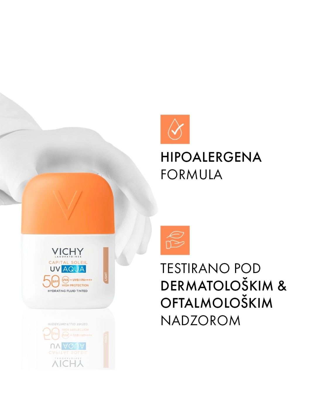 Novi UV Aqua nevidljivi fluid SPF 50, hidracijski, svjež, lagano tonirani fluid za lice s naprednom dnevnom UV zaštitom. Ovaj SPF je lagan, svjež i nevidljiv baš poput vode. Zaštita od UVA, UVB zračenja, onečišćenja i oksidacijskog stresa. Pruža dugotrajnu hidraciju u vodenastoj teksturi koja je nevidljiva na svim fototipovima i trenutno se upija. Otporan na vodu, hipoalergen i pogodan za područje oko očiju i kapke. Precizan aplikator za najugodnije iskustvo pri nanošenju. Neodoljiv miris.""