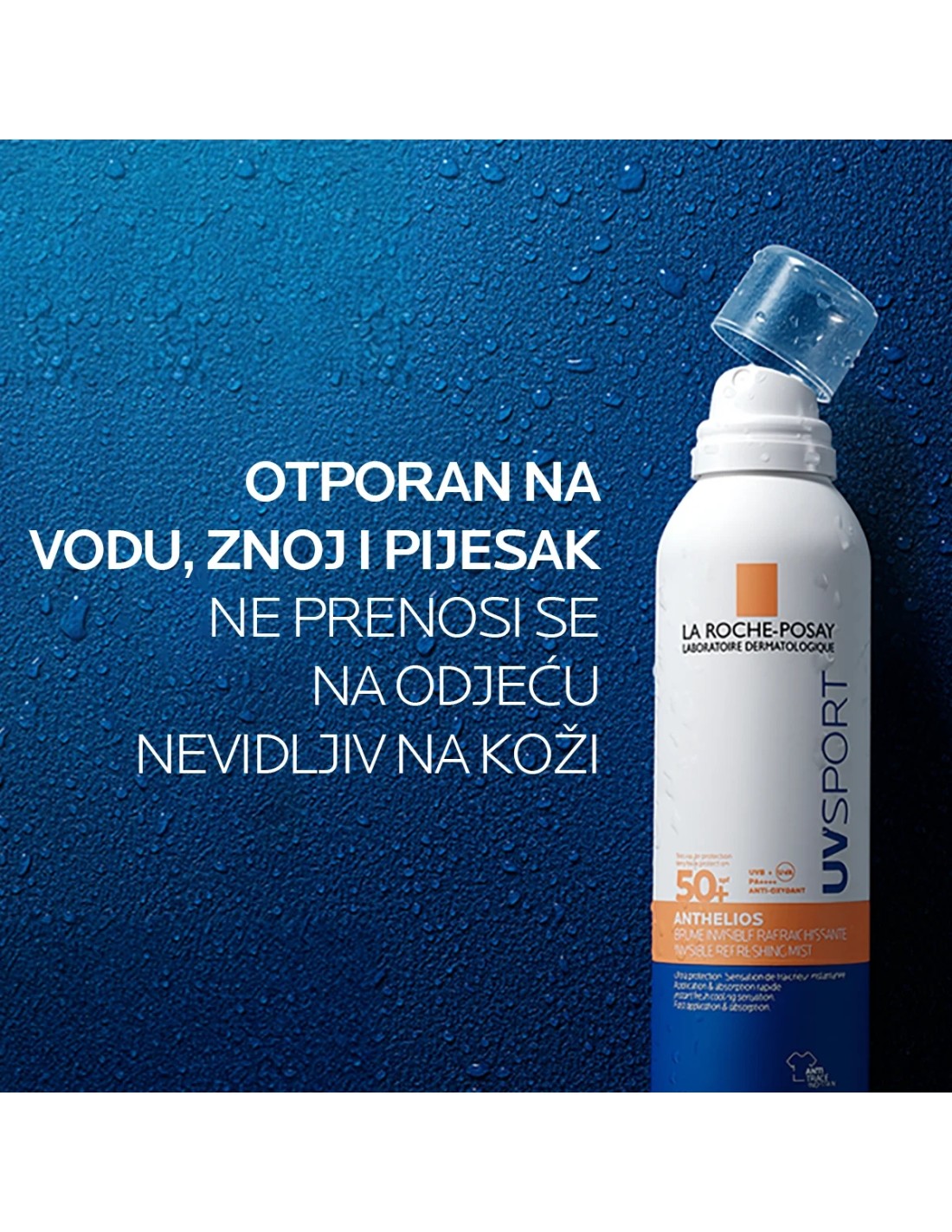 La Roche-Posay Anthelios UVSPORT Mist SPF 50+ je lagani, vrlo učinkovit sprej/mist za zaštitu kože od sunca, osmišljen za aktivne vanjske dane, sport i svakodnevnu zaštitu. Pruža vrlo visoku zaštitu SPF 50+ protiv UVA i UVB zraka, uz osvježavajući i gotovo nevidljiv završetak koji se brzo upija i ne ostavlja masni trag.