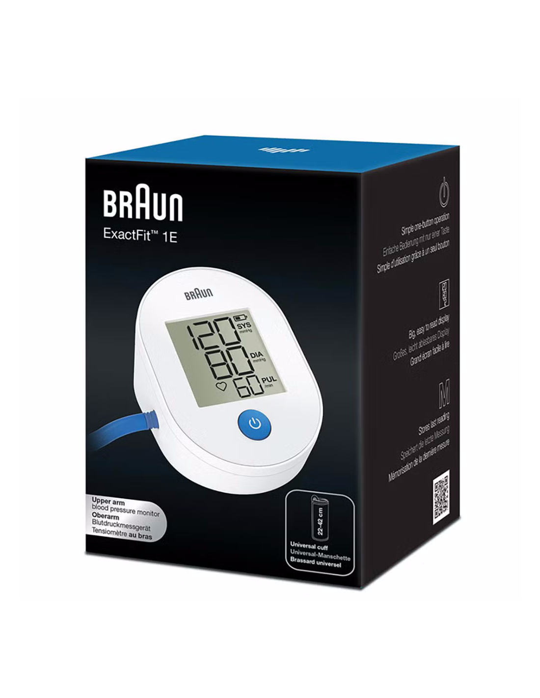 Pratite zdravlje svog srca bez napora uz Braun ExactFit 1E. Ovaj klinički potvrđen uređaj pruža točna mjerenja i jednostavan dizajn za udobno praćenje kod kuće.