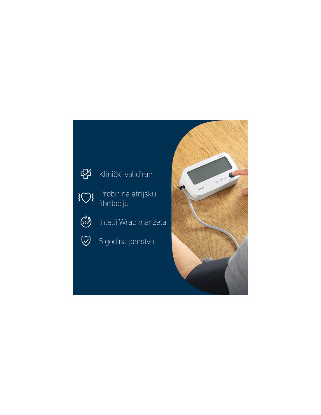 Uređaj dolazi s Intelli Wrap manžetom (22–42 cm) koja omogućuje precizna mjerenja bez obzira na položaj manžete oko nadlaktice, čime se smanjuje rizik od pogrešnih rezultata — idealno i za korisnike koji prvi put mjere tlak.