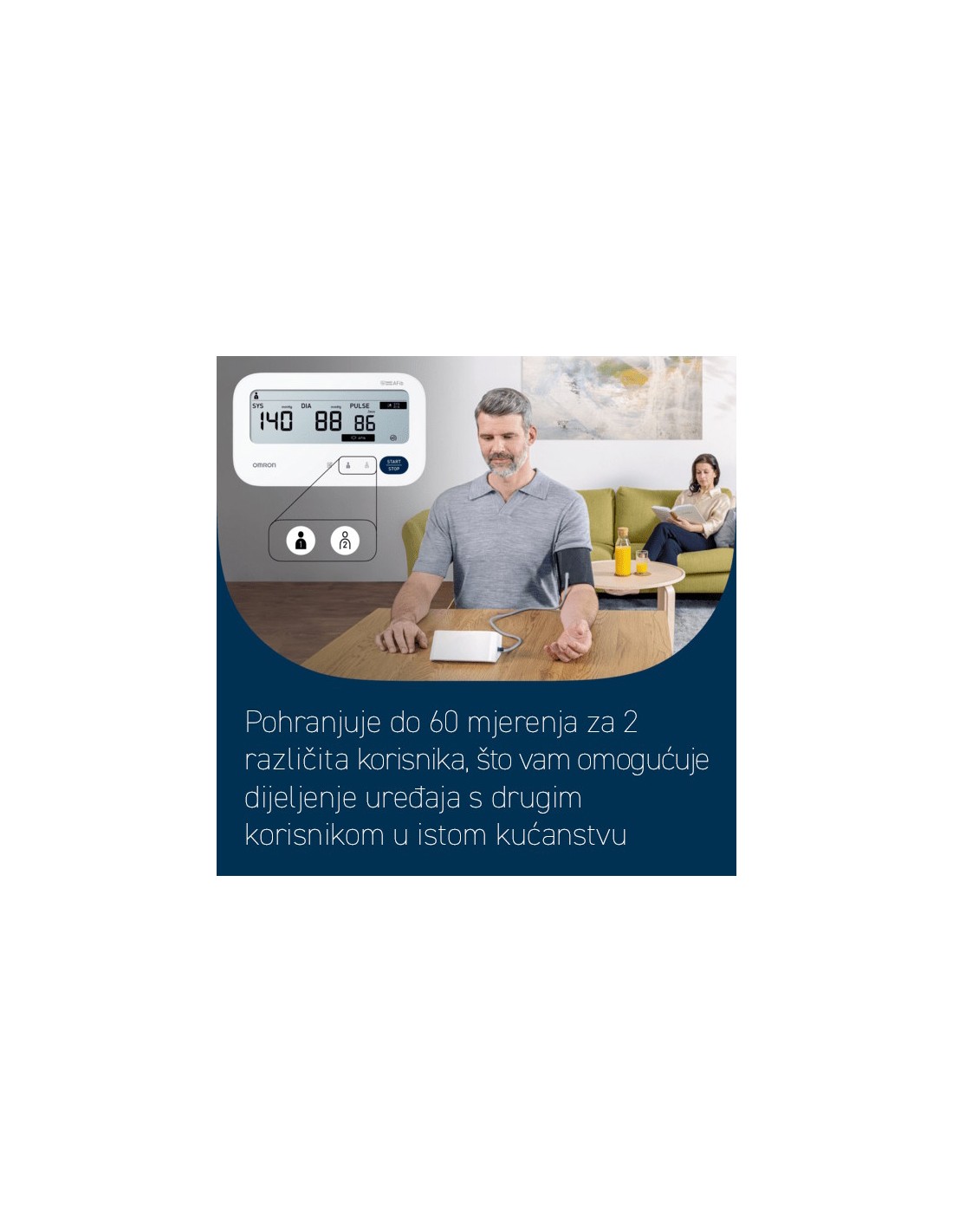 - Tlakomjer omogućuje pohranu do 60 mjerenja za dva korisnika, uz dodatni gostujući način rada za povremeno korištenje.