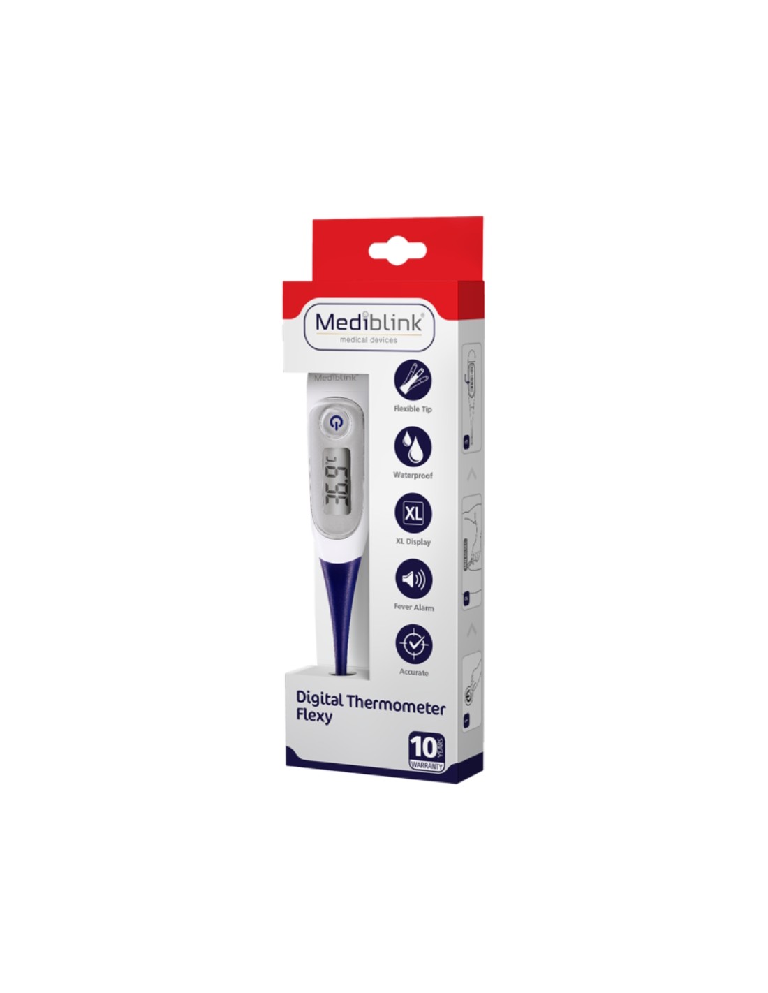 Mediblink Digitalni termometar sa gibljivim vrhom Flexy M374 namijenjen je za mjerenje temperature ljudskog tijela oralno, rektalno ili ispod ruke.