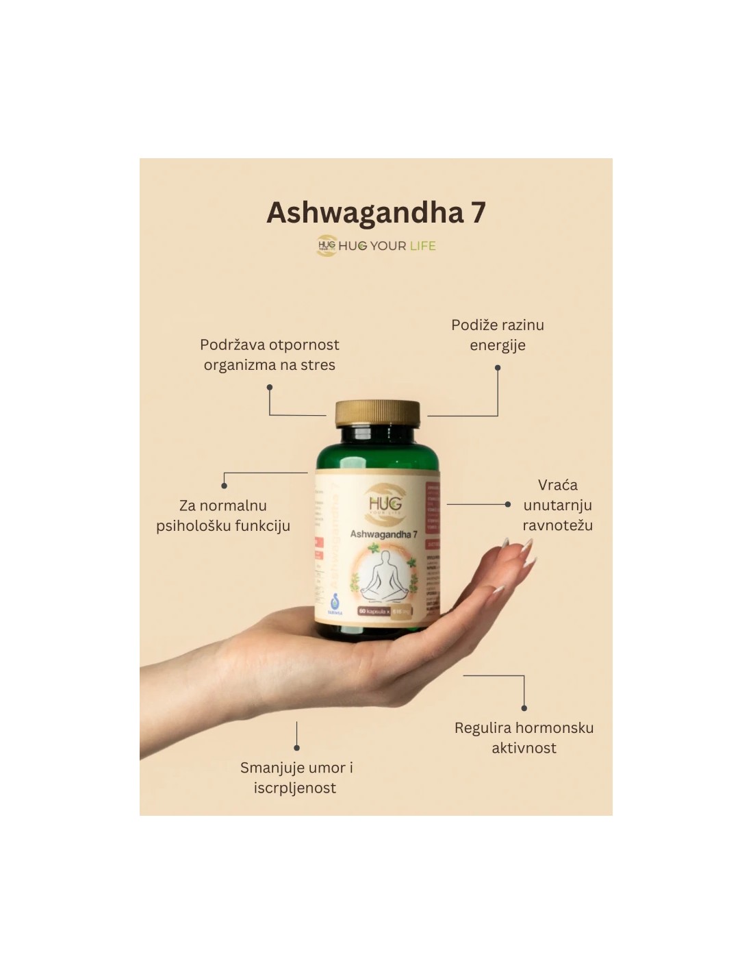 Odlična sinergija sastojaka za podršku svakodnevici s manje stresa i više energije. U središtu formule nalazi se Ashwagandha s visokim udjelom od 7% vitanolida, najvišim na hrvatskom tržištu, u pažljivo usklađenoj kombinaciji sa svetim bosiljkom, sibirskim ginsengom i vitaminima B kompleksa. Njezina učinkovitost potvrđena je kroz 23 službeno odobrene zdravstvene tvrdnje.