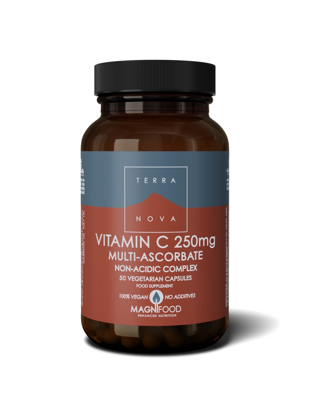 Terranova Vitamin C 250 mg sadrži prirodne izvore vitamina C, poput šipka, acerole, acai bobica i pasjeg trna, koji doprinose normalnom funkcioniranju imunološkog sustava, zaštiti stanica od oksidativnog stresa i stvaranju kolagena.