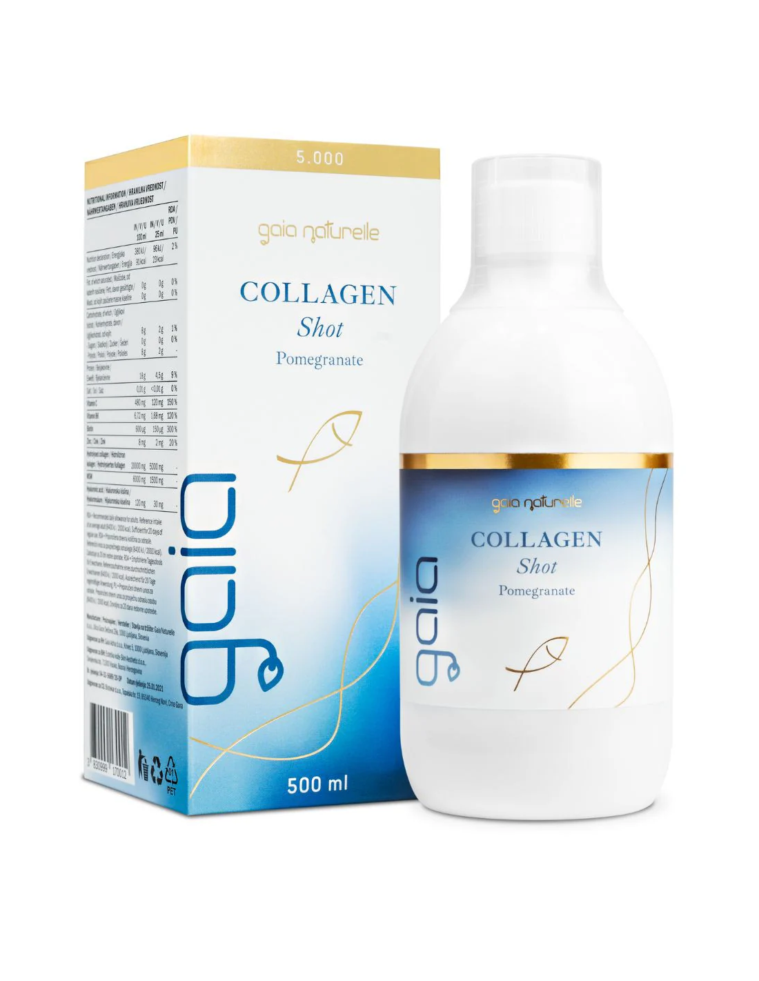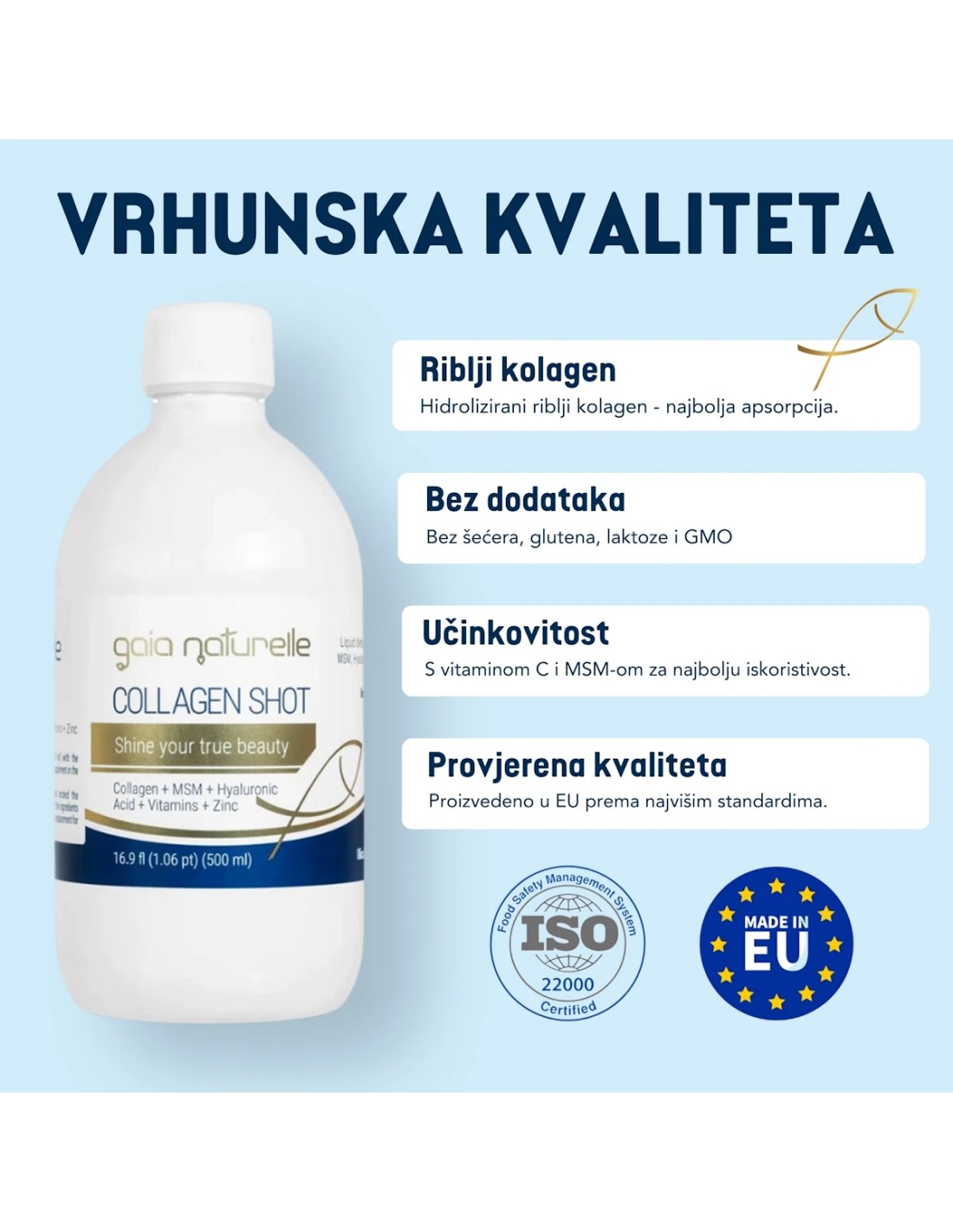 Sastav: Kolagen shot sadrži 5000 mg ribljeg kolagena, 1500 mg MSMa, 30 mg hijaluronske kiseline, 150 µg biotina, vitamine C, B6 i cink.L-selenometionin, sredstvo za reguliranje kiselosti: limunska kiselina, prirodne arome, konzervansi: kalijev sorbat, natrijev benzoat. Može sadržavati rakove i proizvode od njih.
